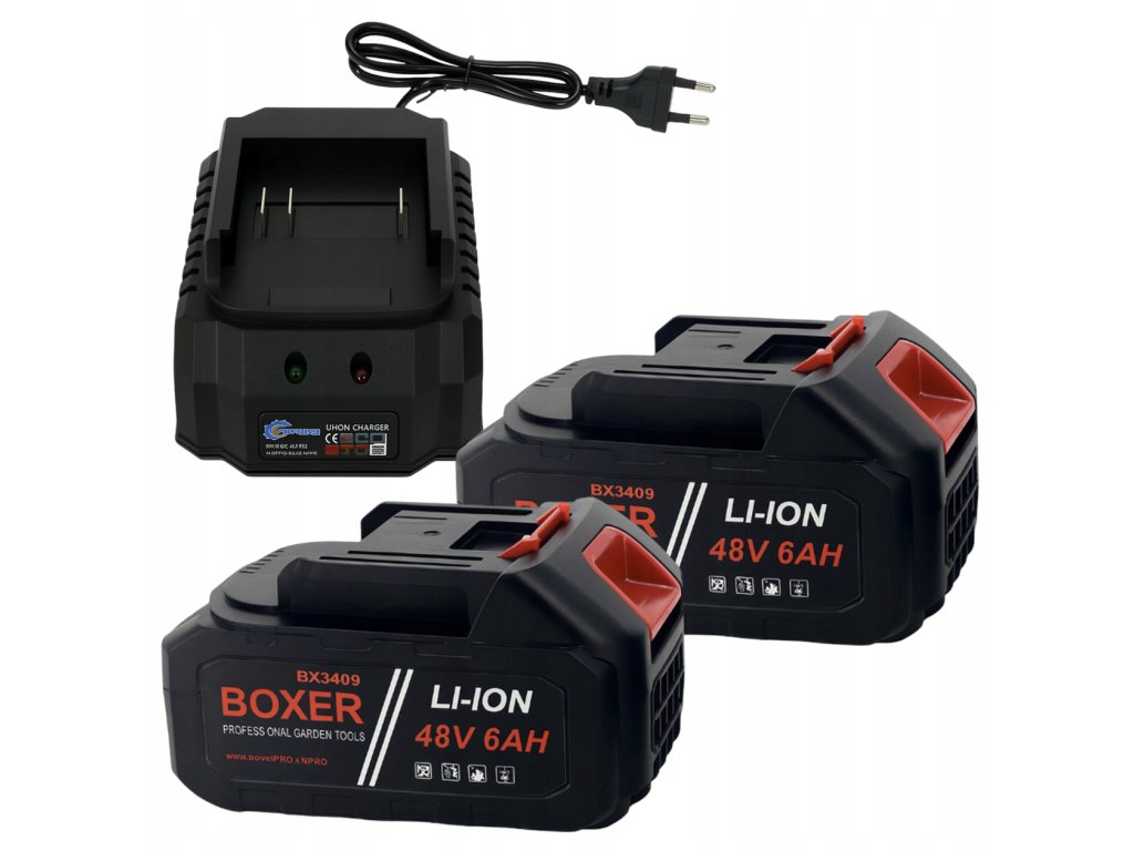 Součástí balení jsou dvě baterie Li-Ion 48 V a rychlonabíječka (cca 2,5 h). Získáte dlouhou výdrž a možnost pracovat např. s jednou baterií v nabíječce a druhou v přístroji.