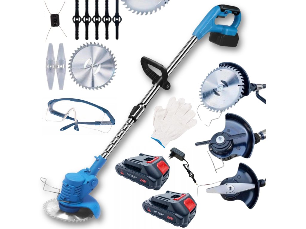 - Kompletní výbava: 2× baterie (Li‑ion 24 V / 3 Ah) + nabíječka + čepele + pracovní rukavice + ochranné brýle