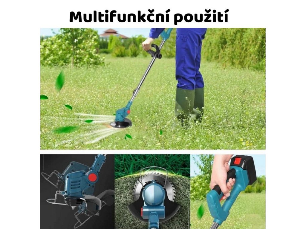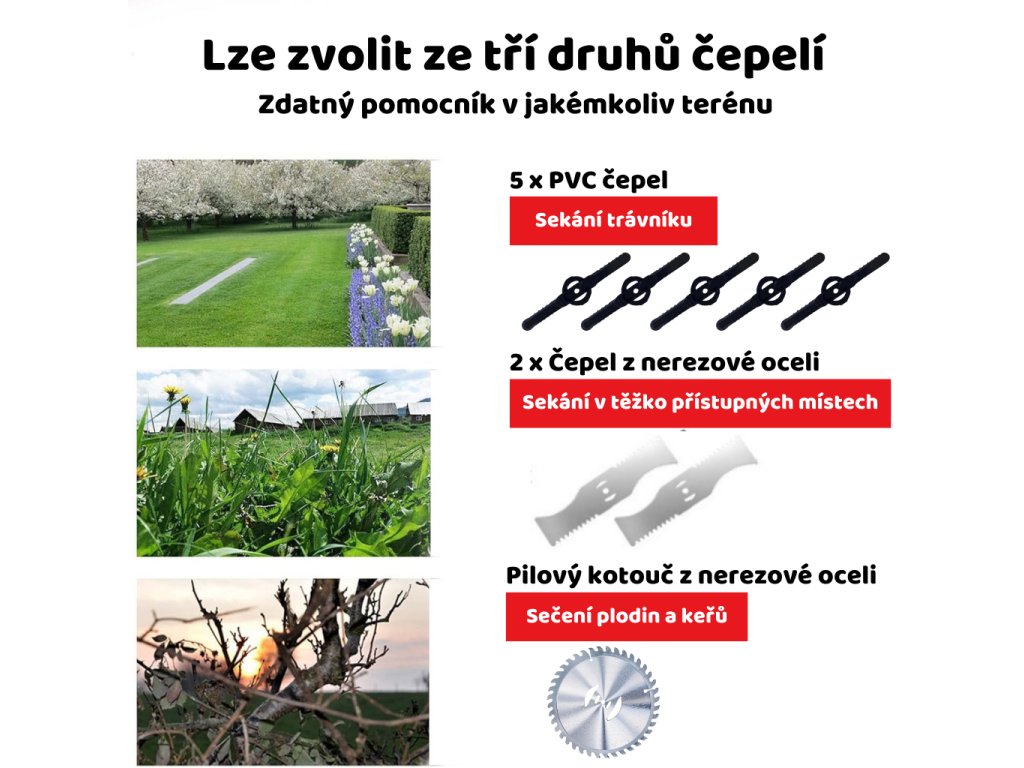 - 3 typy čepelí: 5× PVC (tráva), 2× nerez (plevel), 1× pilový kotouč (větve), 1x strunová hlava ⚙️