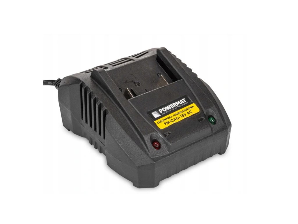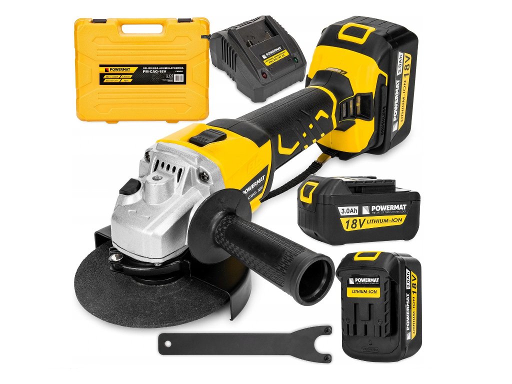 Výkonná a pohodlná úhlová bruska Powermat PM-CAG-18V 125 mm, napájená 18v Li-Ion baterií s kapacitou až 3,0 Ah. Akumulátor lze použít v jiných kompatibilních bateriových zařízeních Powermat s upevněním F18 +.