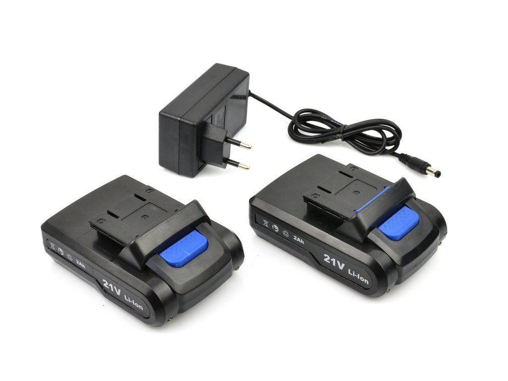 Akumulátorová vrtačka-šroubovák 21 V . Nástroj je ideální pro vrtání do různých materiálů a pro zašroubování a vyšroubování šroubů, vrutů, plechových šroubů atd. Součástí sady jsou dvě baterie 2 Ah, nabíječka a praktický plastový kufřík.