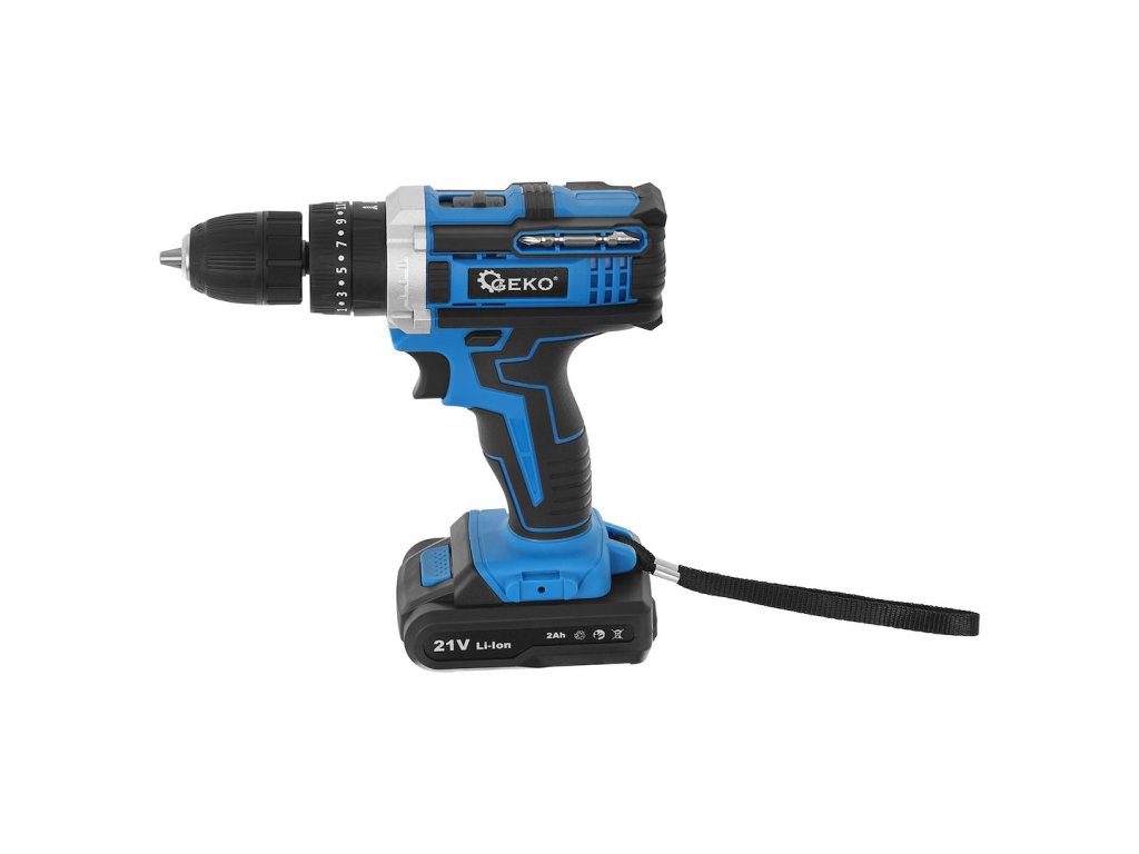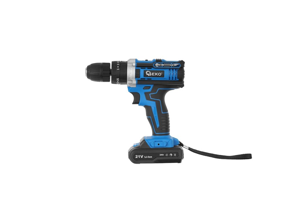 Akumulátorová vrtačka/šroubovák 21 V s funkcí příklepu . Nástroj je ideální pro vrtání do různých materiálů a pro zašroubování a vyšroubování šroubů, vrutů, plechových šroubů atd. Sada obsahuje dva akumulátory 2 Ah, nabíječku a praktický plastový kufřík.