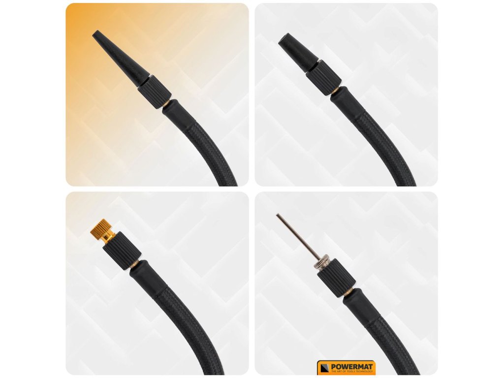 Součástí balení jsou univerzální nástavce, díky kterým nahustíte pneumatiky auta, kola, skútru, míče, matrace, nafukovačky i další vybavení.