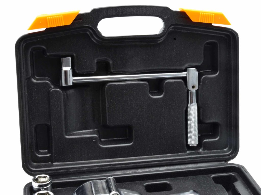 TECHNICKÉ ÚDAJE: - Maximální točivý moment 300 Nm - Nástavce 17 mm, 19 mm, 21 mm - Klika v sadě - Celek v plastovém kufříku