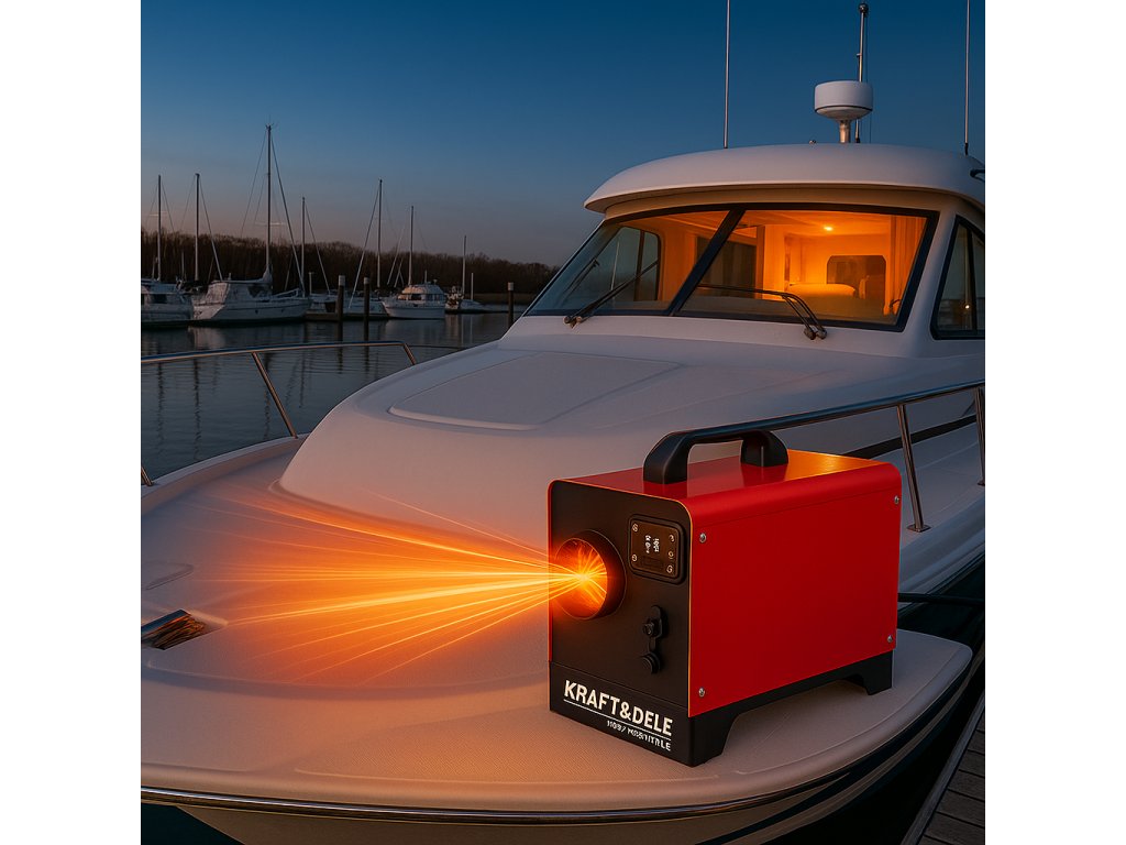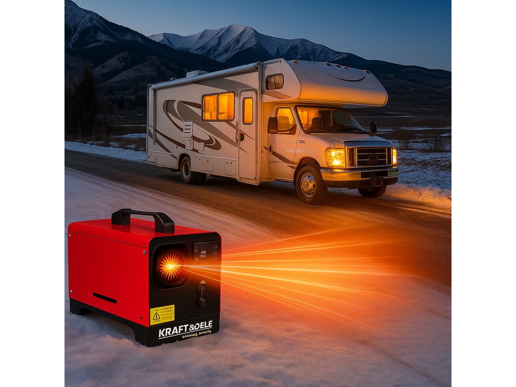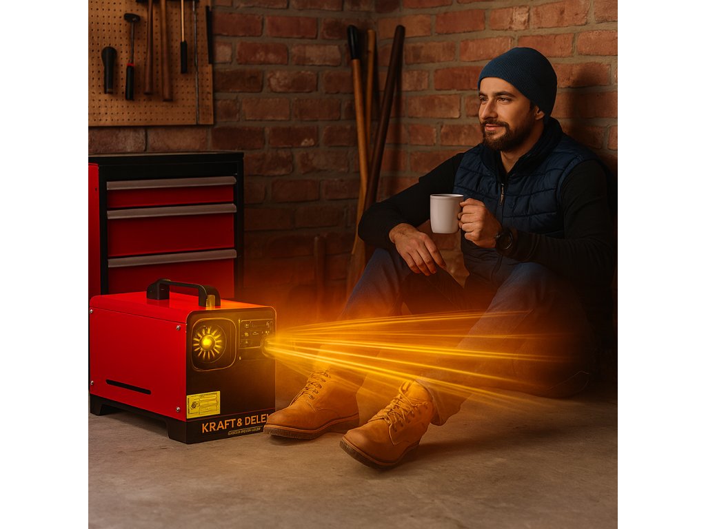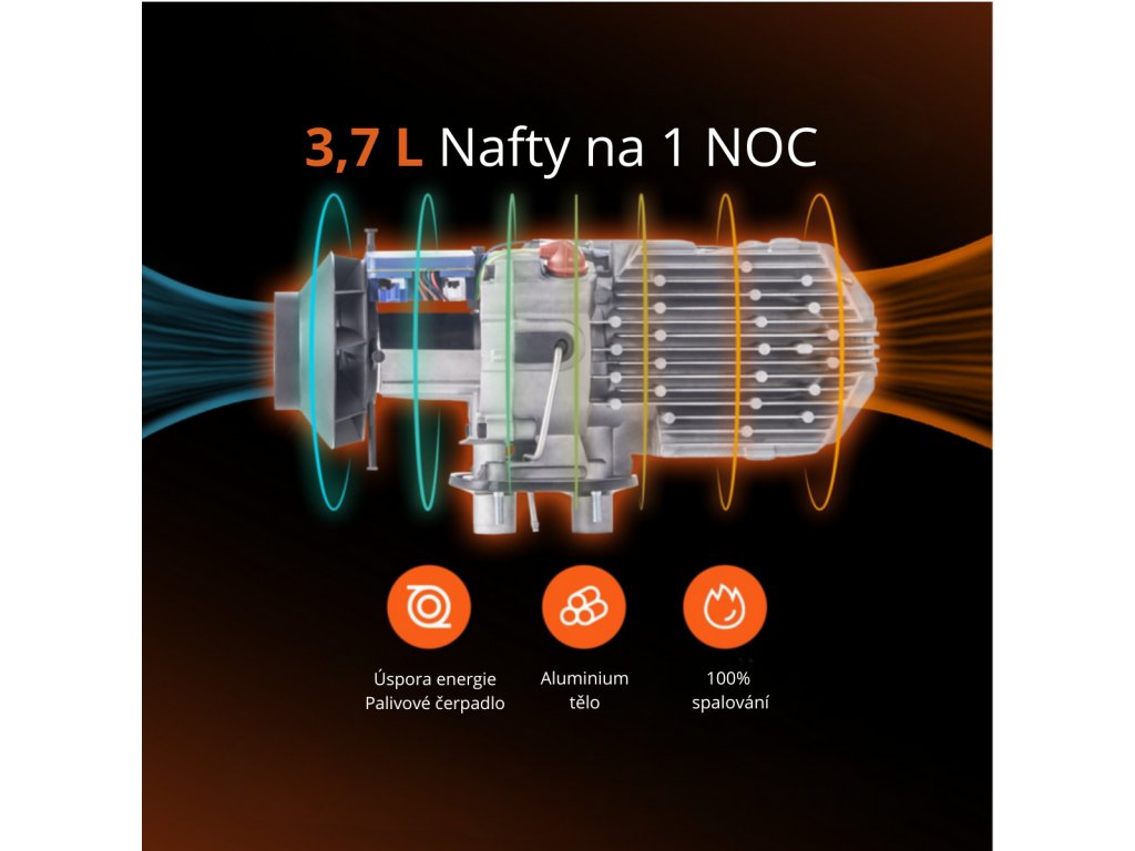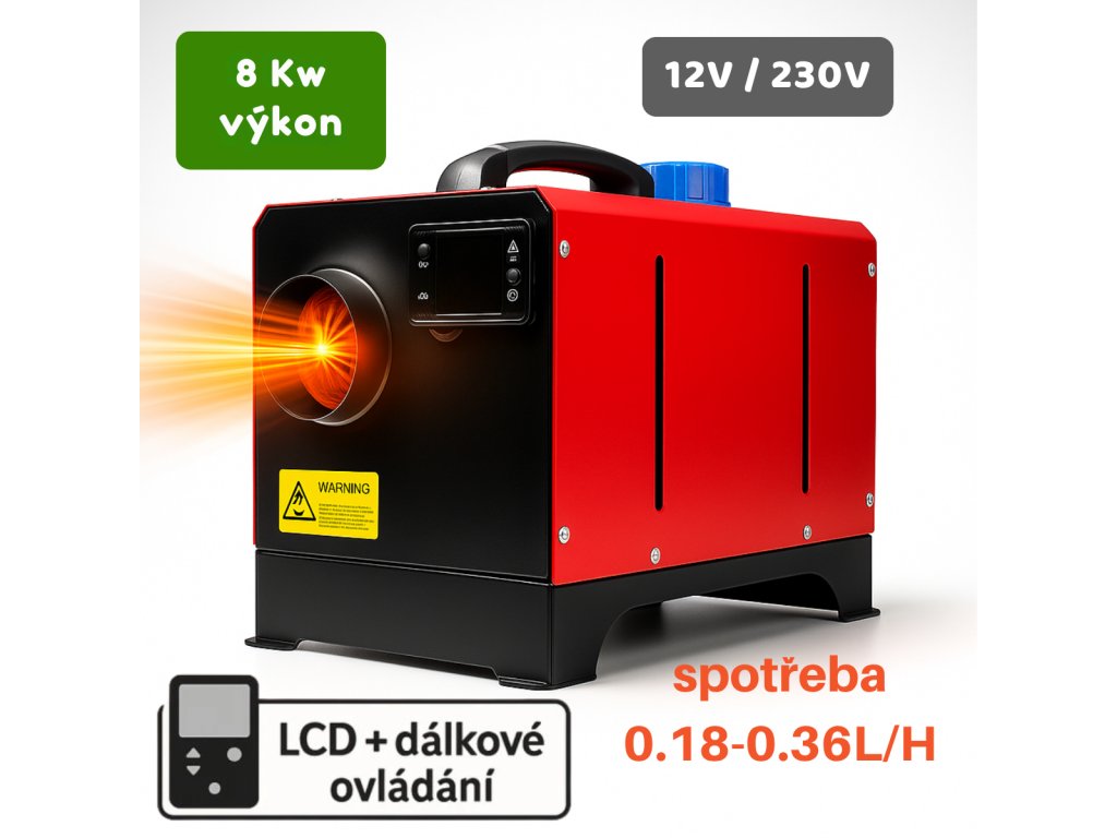 - 🔥 Výkon 8 kW – rychle vyhřeje kabinu, karavan, dílnu i přívěs.