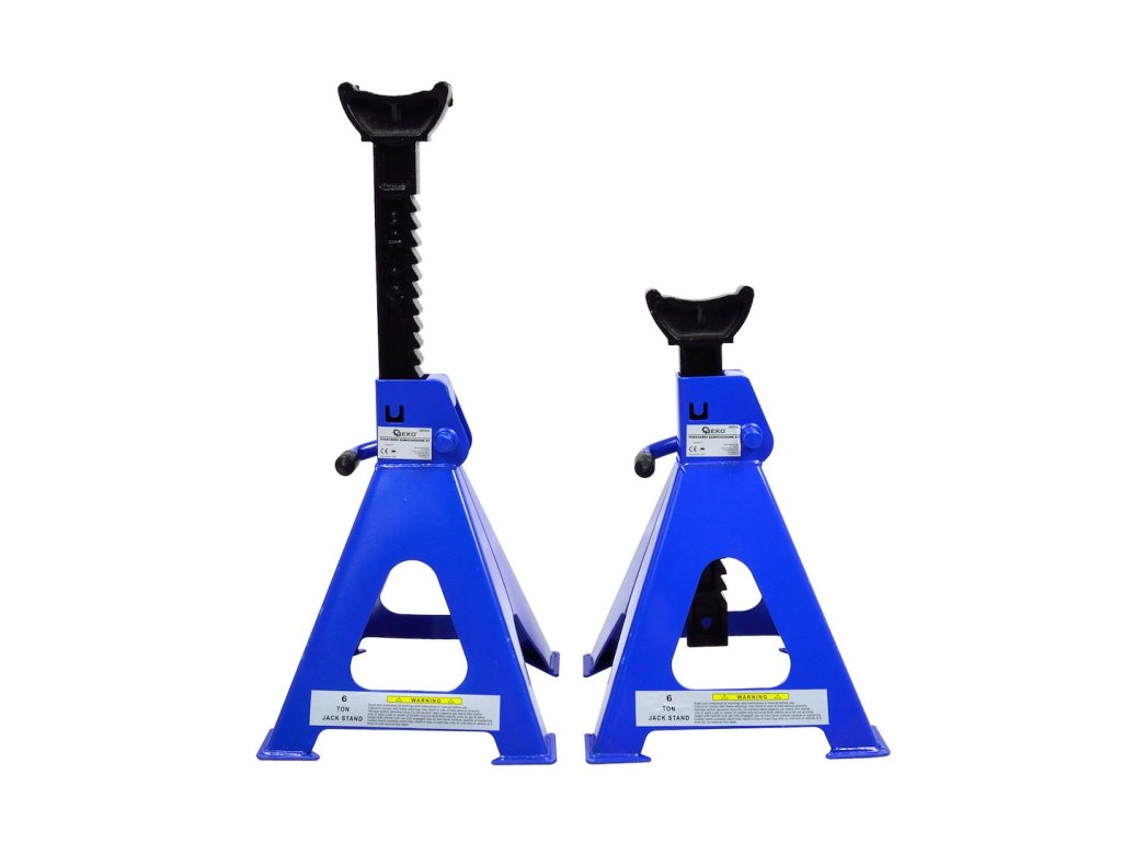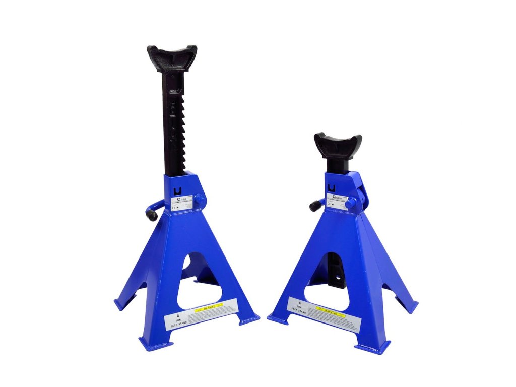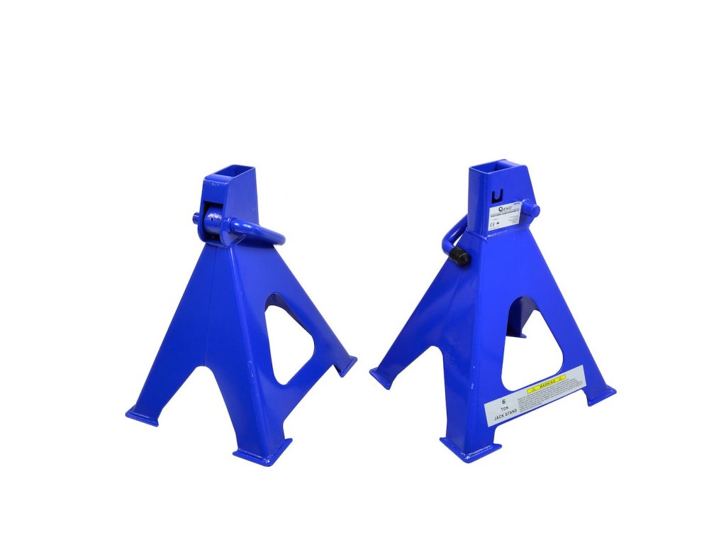 Sada 6T podstavců pro automobily . Velmi pevné stojany z tlustého ocelového plechu s ráčnovým mechanismem umožňujícím velmi přesné nastavení výšky v několika úrovních.
