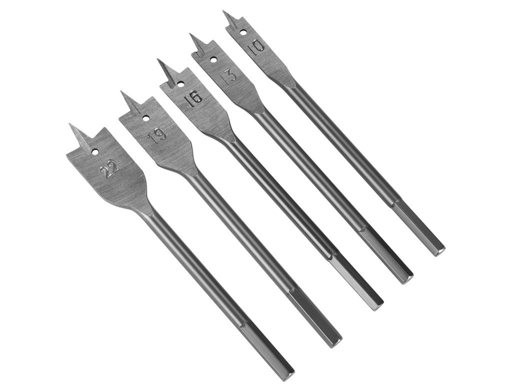 - 5 vrtáků do dřeva tyčového typu (rozměry 10 – 13 – 16 – 19 – 22 mm)