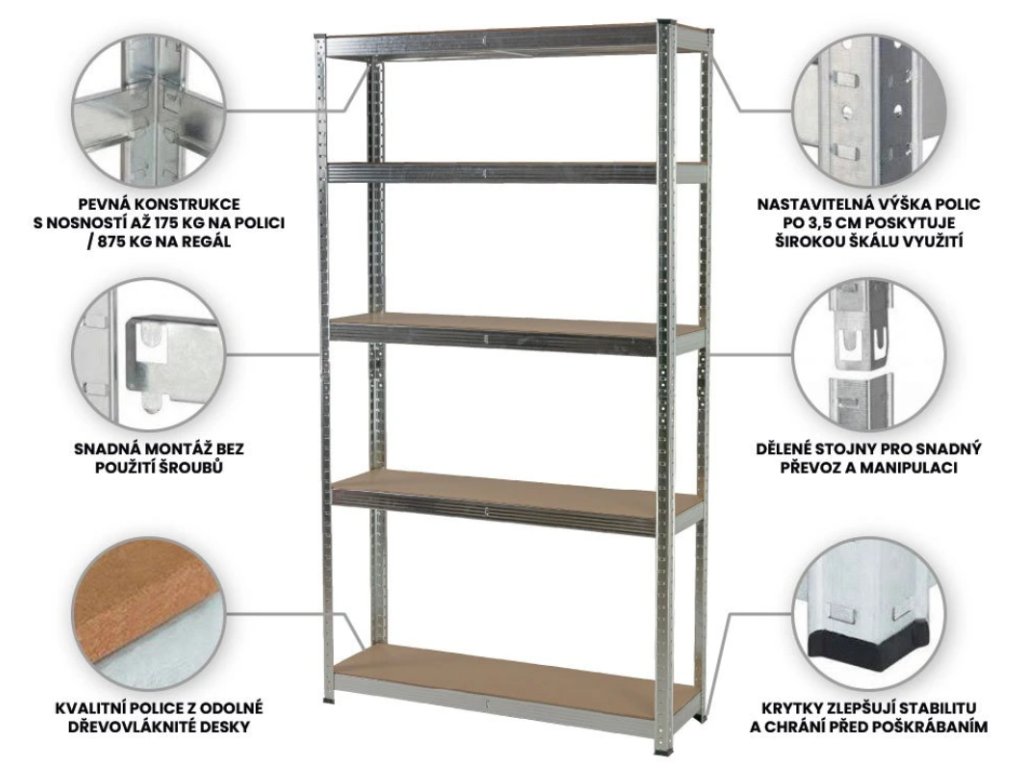 Objevte nový standard v úložných řešeních – robustní 5patrový regál s celkovou nosností až 875 kg a montáží bez šroubů. Ideální do dílny, sklepa, skladu i domácnosti.