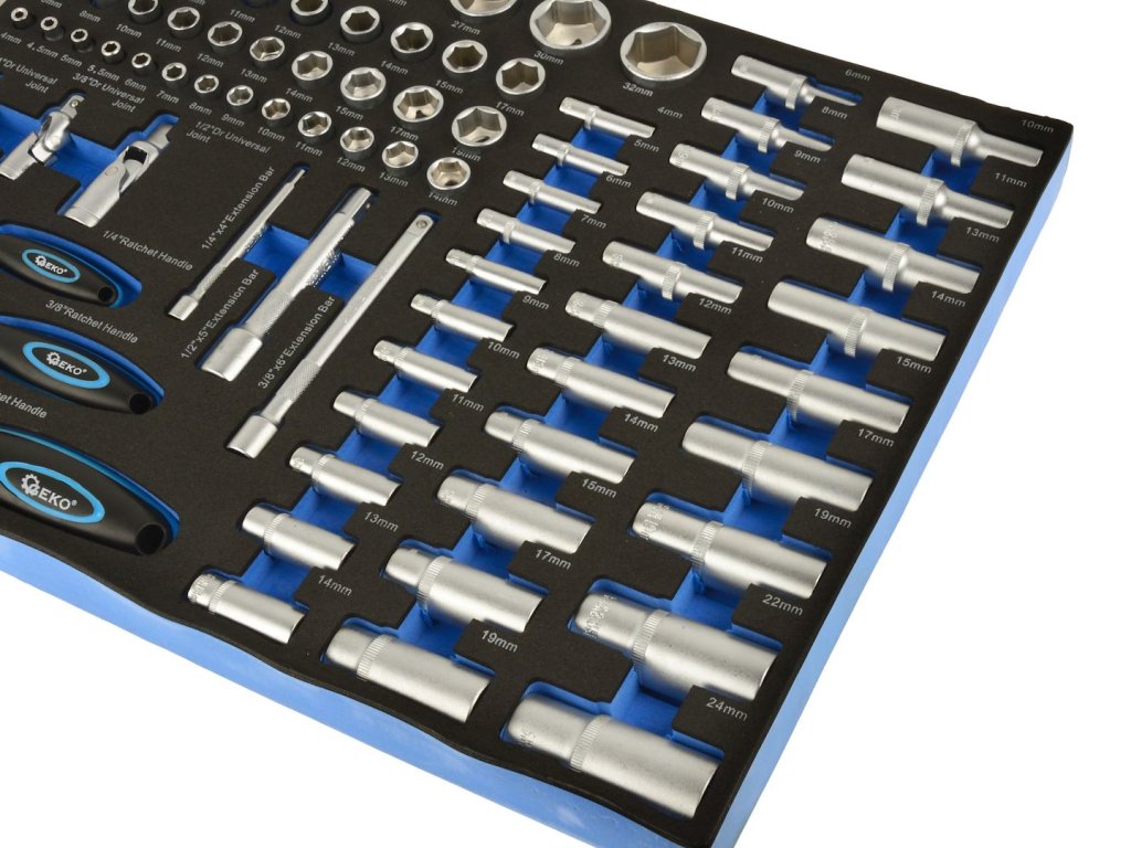 Obsah balení: 1/2" Standardní šestihranné nástrčné klíče (délka = 36 mm): 8, 9, 10, 11, 12, 13, 14, 15, 17, 19, 20, 21, 22, 24, 27, 30, 32 mm 3/8" Standardní šestihranné nástrčné klíče (délka = 26 mm)