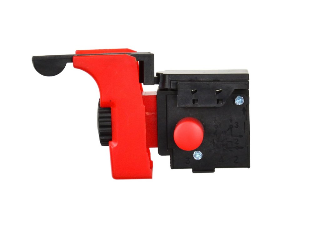 Tlačítkový spínač s regulací otáček, změnou směru otáčení vpravo/vlevo a aretací spínače v poloze trvale zapnuto.