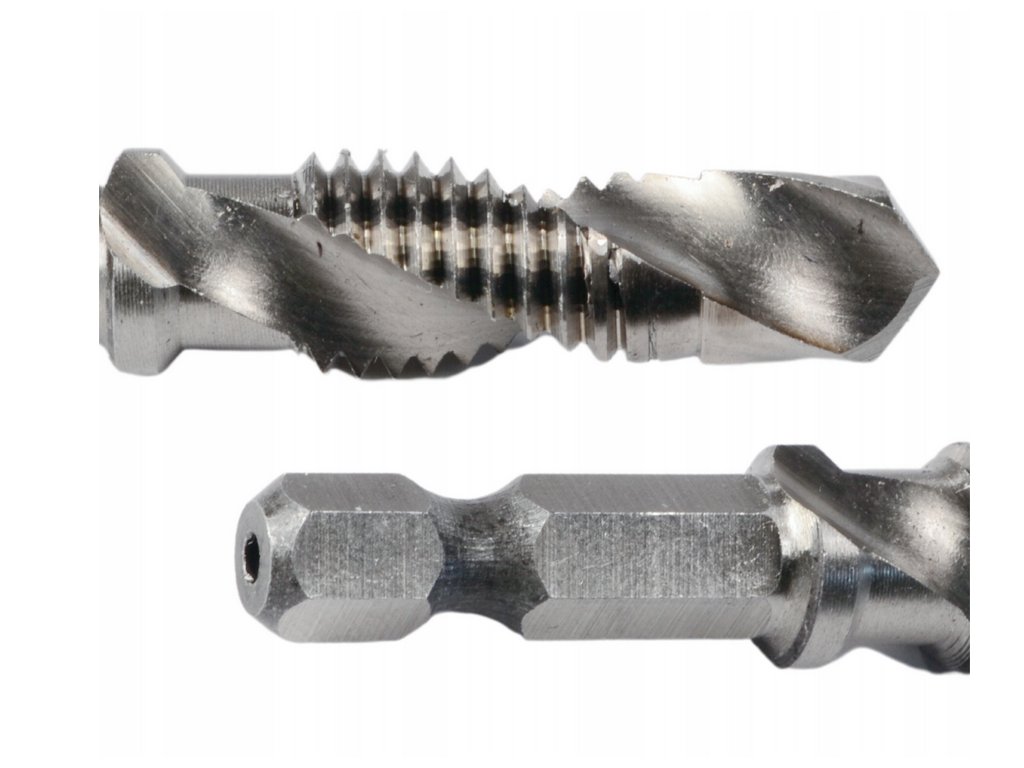 - Tato sada obsahuje šestihranné závitové vrtáky vyrobené z rychlořezné oceli (HSS), které umožňují vrtání, řezání závitů a srážení hran v jednom kroku