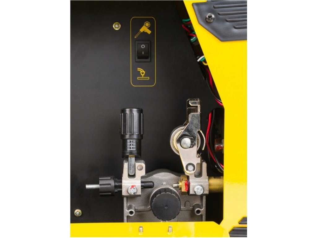 ARC FORCE stabilizuje oblouk bez ohledu na jeho délku. Snížení funkčních hodnot dává měkký oblouk a menší hloubku tavení, zatímco zvýšení funkčních hodnot způsobuje hlubší proniknutí a možnost svařování krátkým obloukem. S nejvyšší hodnotou pro funkci ARC FORCE je možné „zatlačit elektrodu do kalu roztaveného kovu a materiál spálit. Tento model má automatické nastavení ARC FORCE. Další možnosti Zásuvka pro externí držák podavače drátu. GUN, který umožňuje svařování s dráty menšího průměru, než jaké jsou k dispozici ve stroji Uvnitř zařízení Přesný mechanismus podávání drátu Standardní spínač hořáku / SPOOL GUN Mobilita zařízení