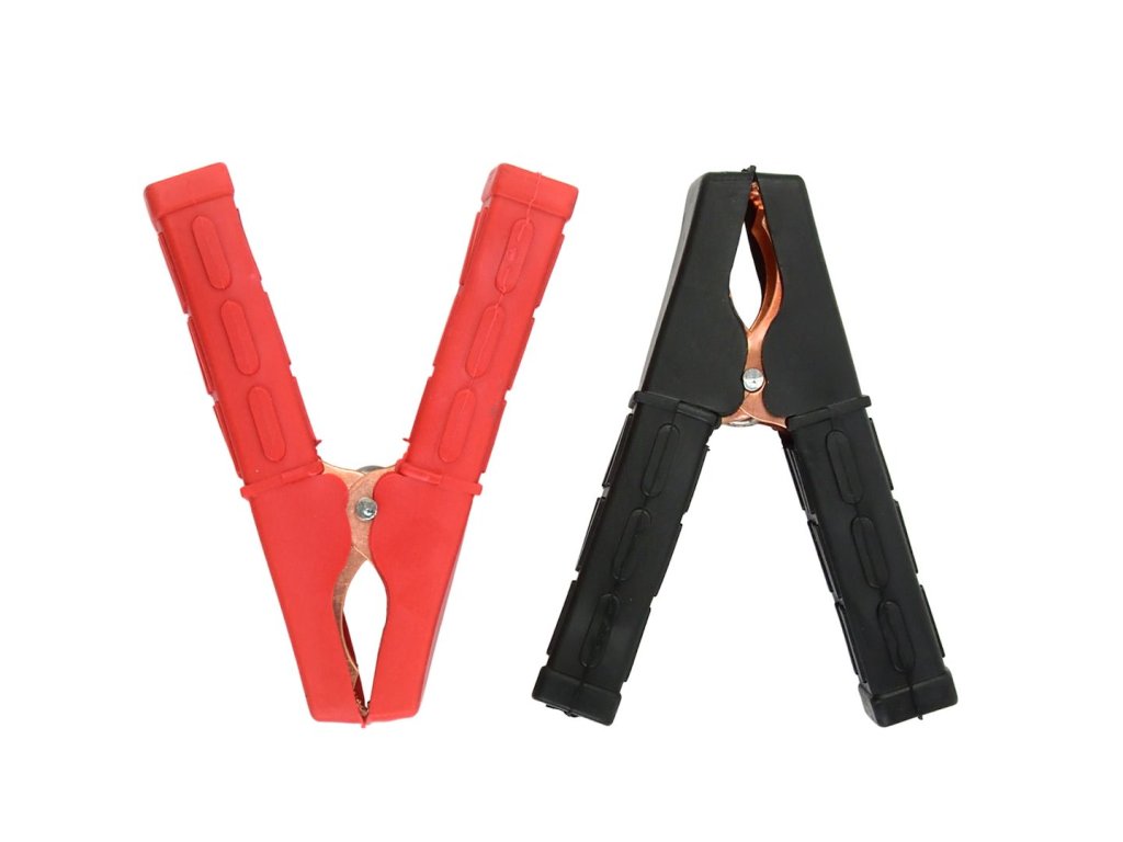Kleště na akumulátory „krokodýly“ , přizpůsobené pro proud o intenzitě nepřesahující 100 A . Určené pro použití v startovacích kabelech, automobilových nabíječkách atd . Silná pružina kleští zaručuje dobré elektrické spojení.