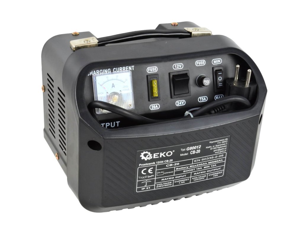 Automatický nabíječ CB-20 je určen k nabíjení olověných akumulátorů (STD) s napětím 12 V nebo 24 V, které se používají mimo jiné v osobních, dodávkových a nákladních automobilech atd. Má zabudovanou pojistku, která chrání zařízení před nesprávným připojením pólů a zkratem.