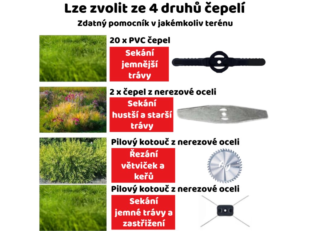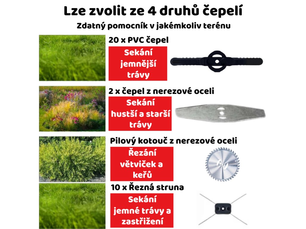 - ⚙️ Kotouč + živková hlava – zvládne trávu i houževnaté porosty