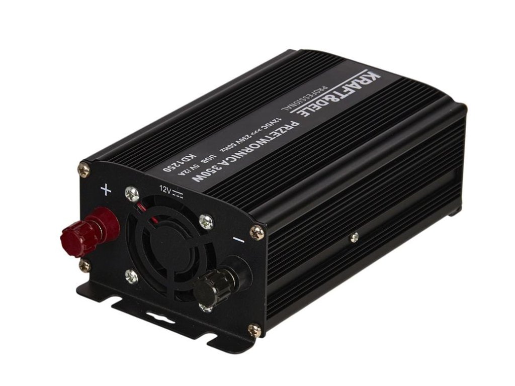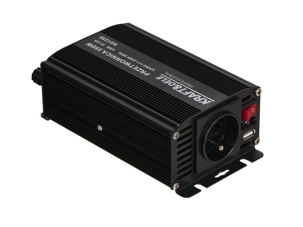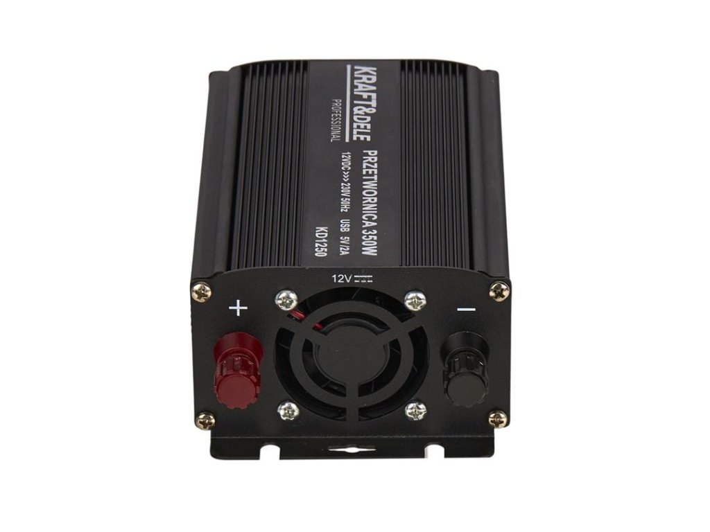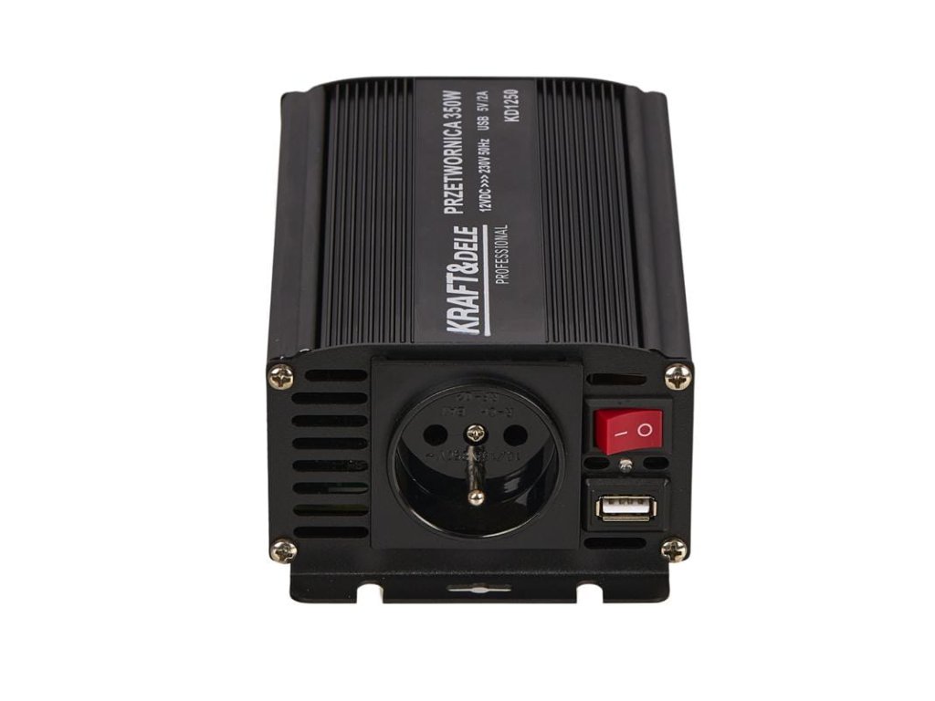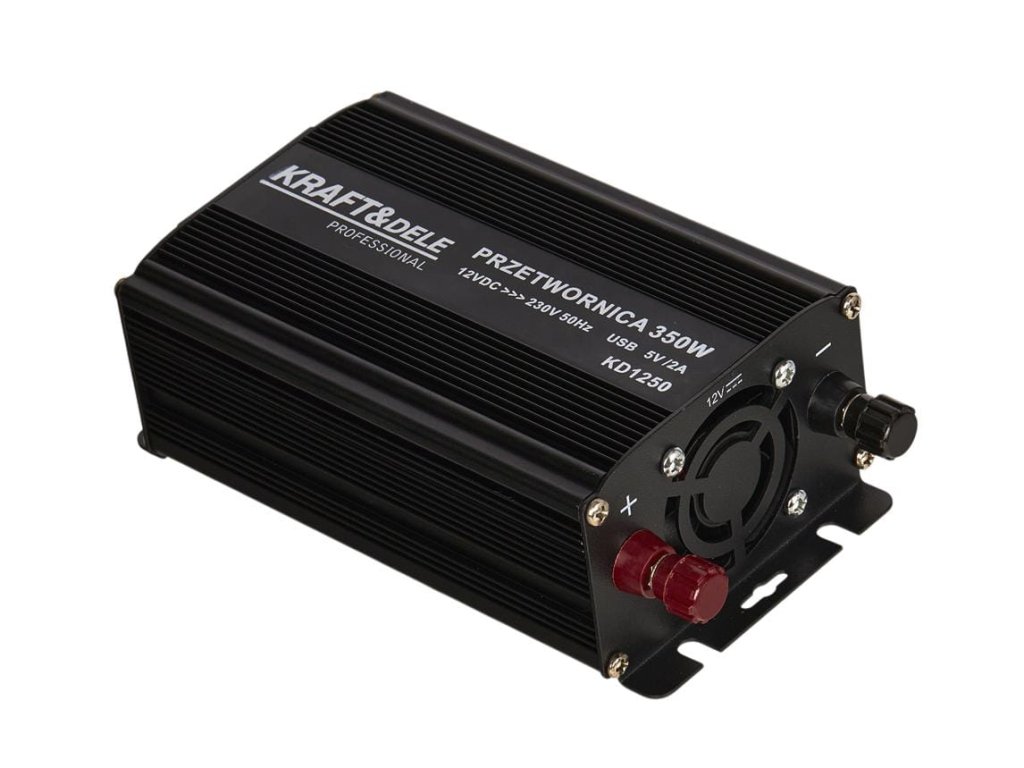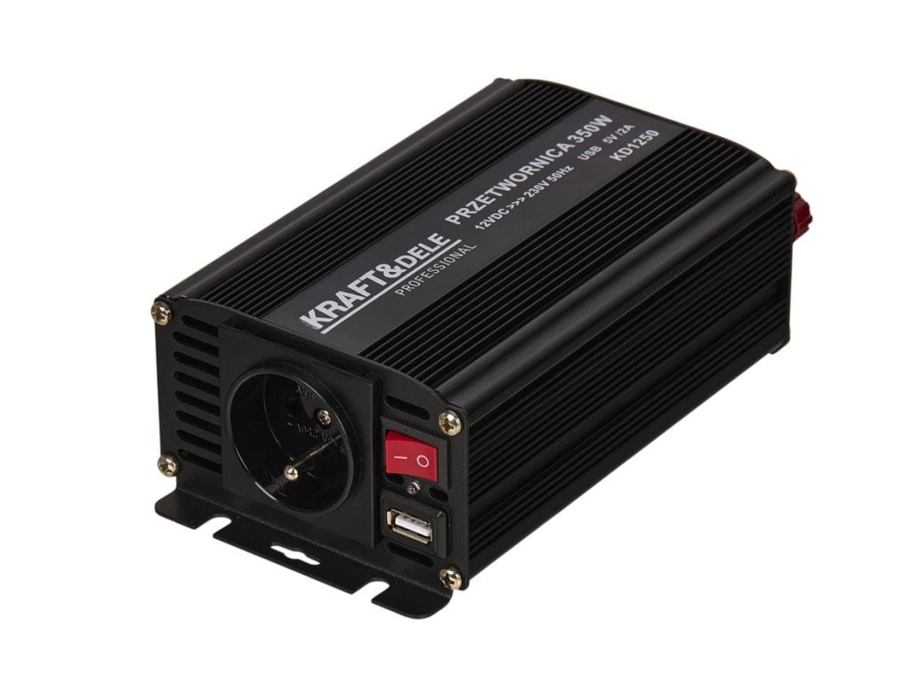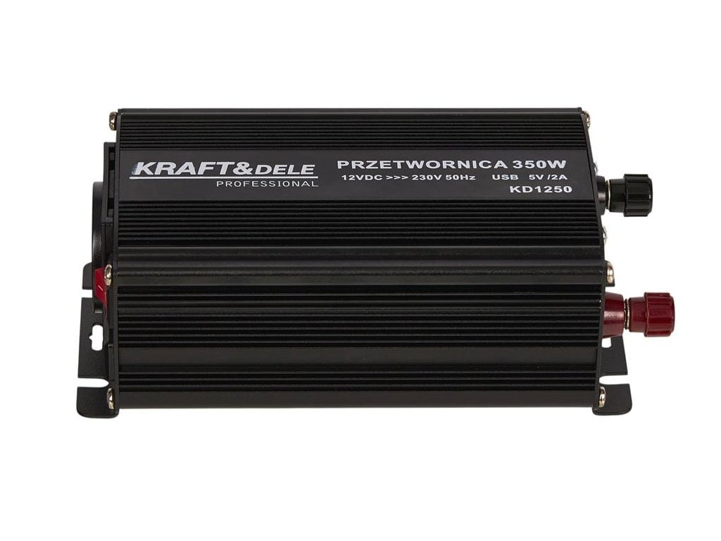 - TECHNICZNE PRODUKTU Marka: KRAFT&DELE Model: KD1250-12V Typ urządzenia: przetwornica DC/AC Moc ciągła: 350 W Moc impulsowa: 700 W Sprawność: 85% Prąd bez obciążenia: < 0,6A Napięcie prądu wyjściowego: 230V Wyjście USB: 5V, 2A SKŁAD ZESTAWU