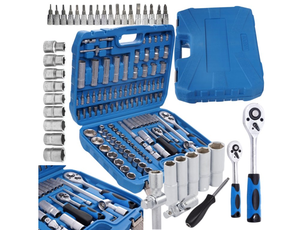 - Obsahuje ráčny 1/4", 3/8" a 1/2", širokou škálu nástavců, bitů a příslušenství