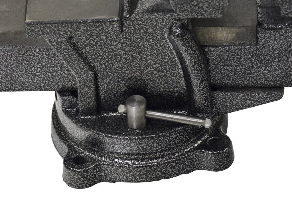 Otočné svěrák, vyrobený z vysoce kvalitních materiálů. Ocelové čelisti svěráku s protiskluzovými křížovými zářezy, navíc kalené. Odolná a pevná konstrukce umožňuje bezpečně upevnit vybraný předmět ve svěráku a zaručuje dlouhou životnost.