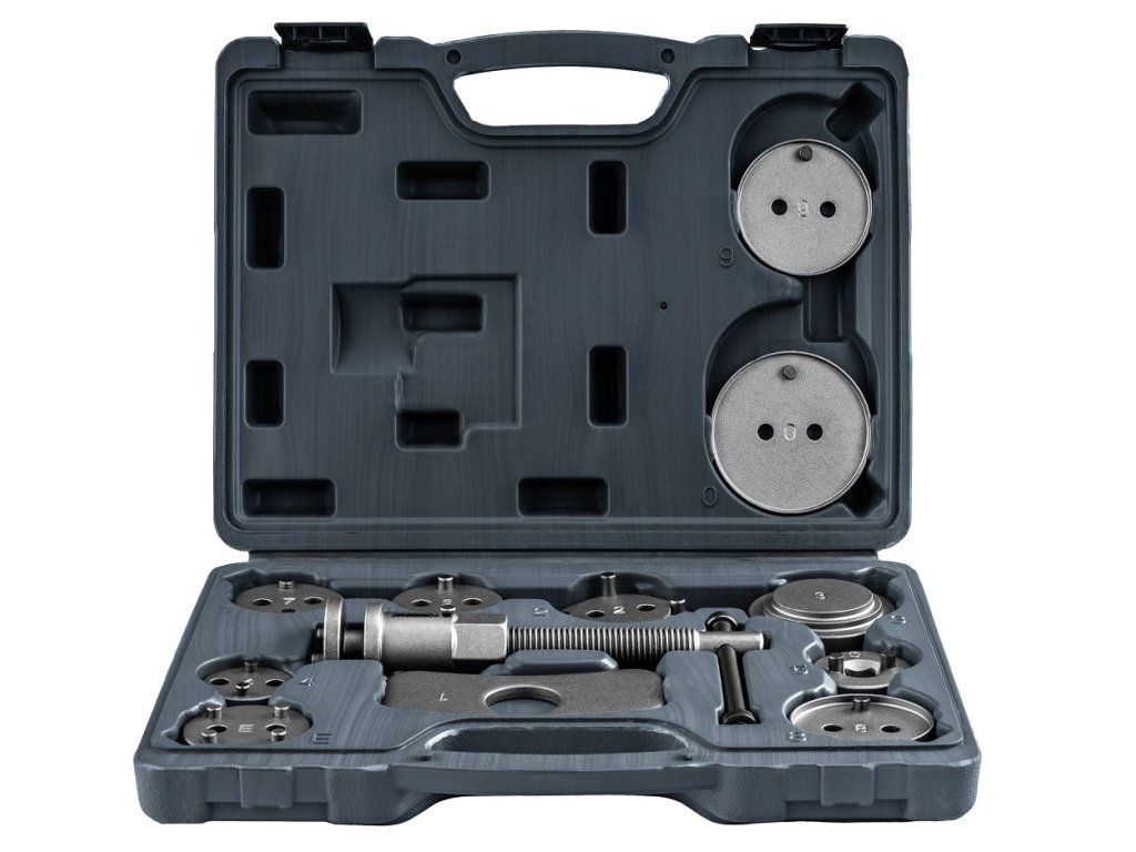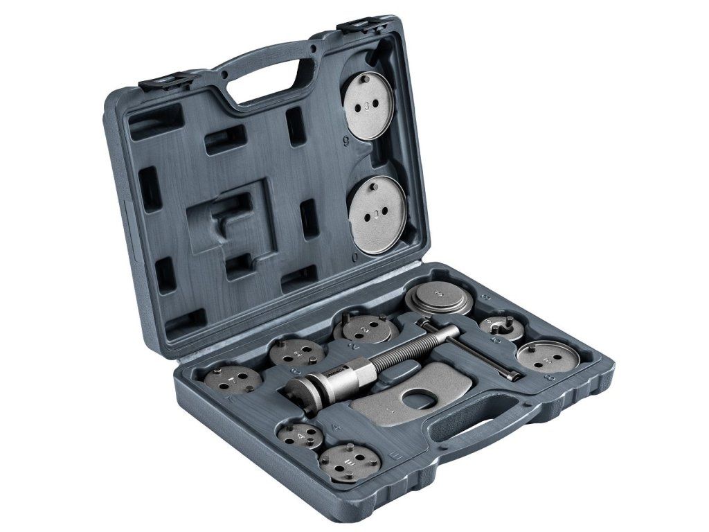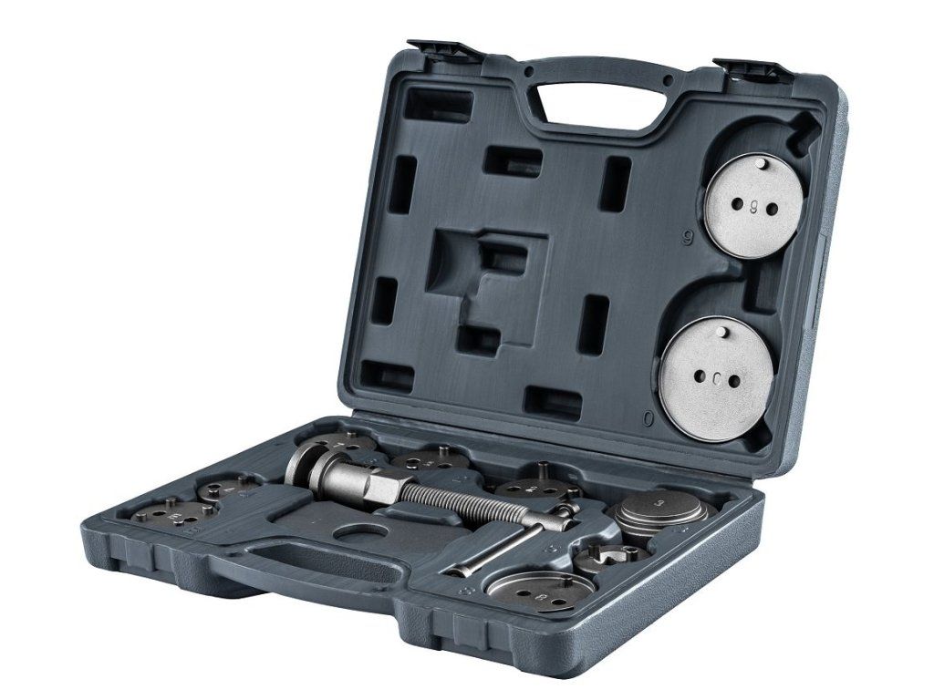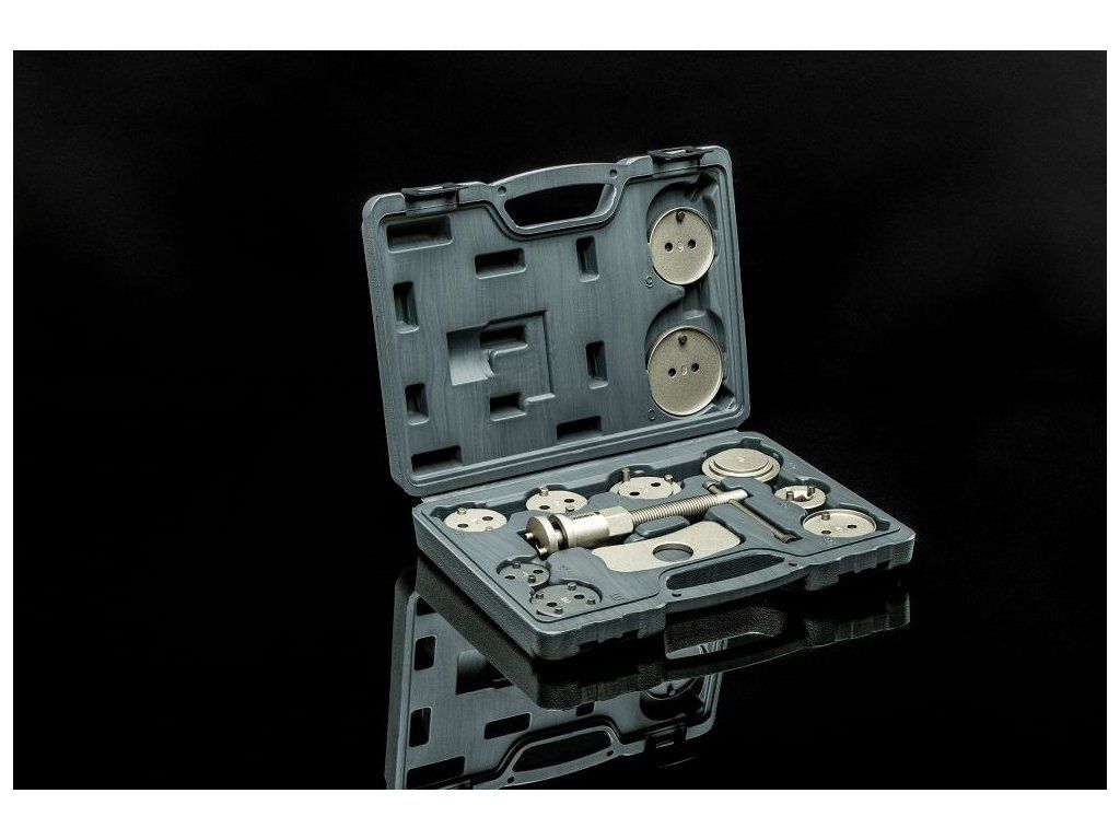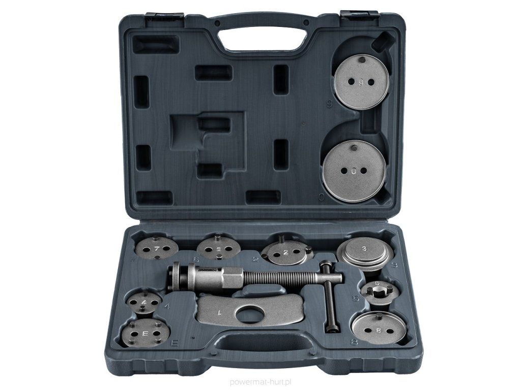 - Zawartość zestawu: praska do cofania tłoczka hamulcowego + 11 adapterów