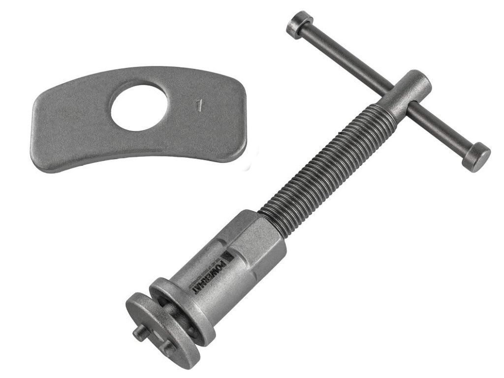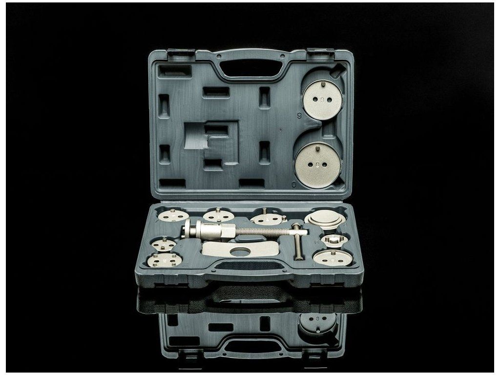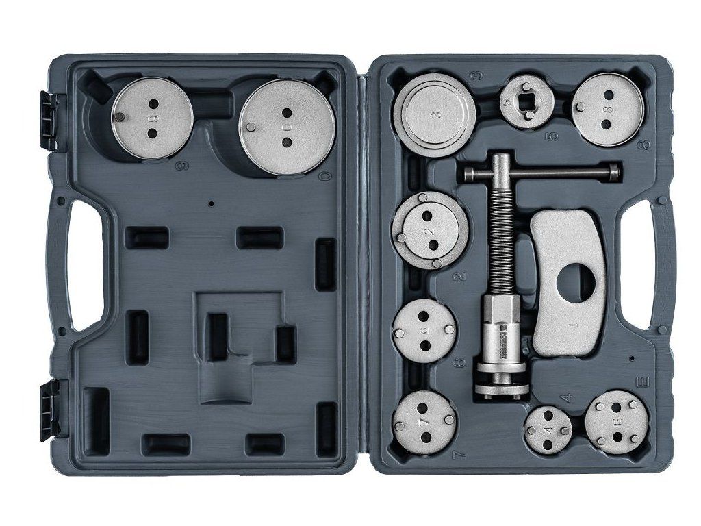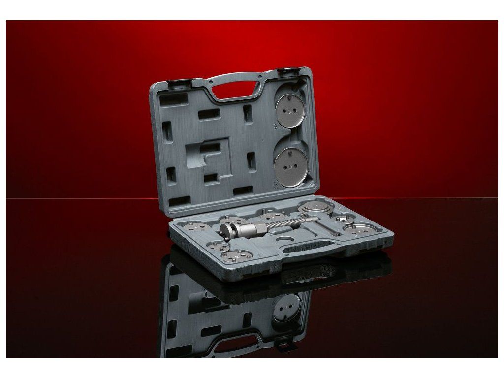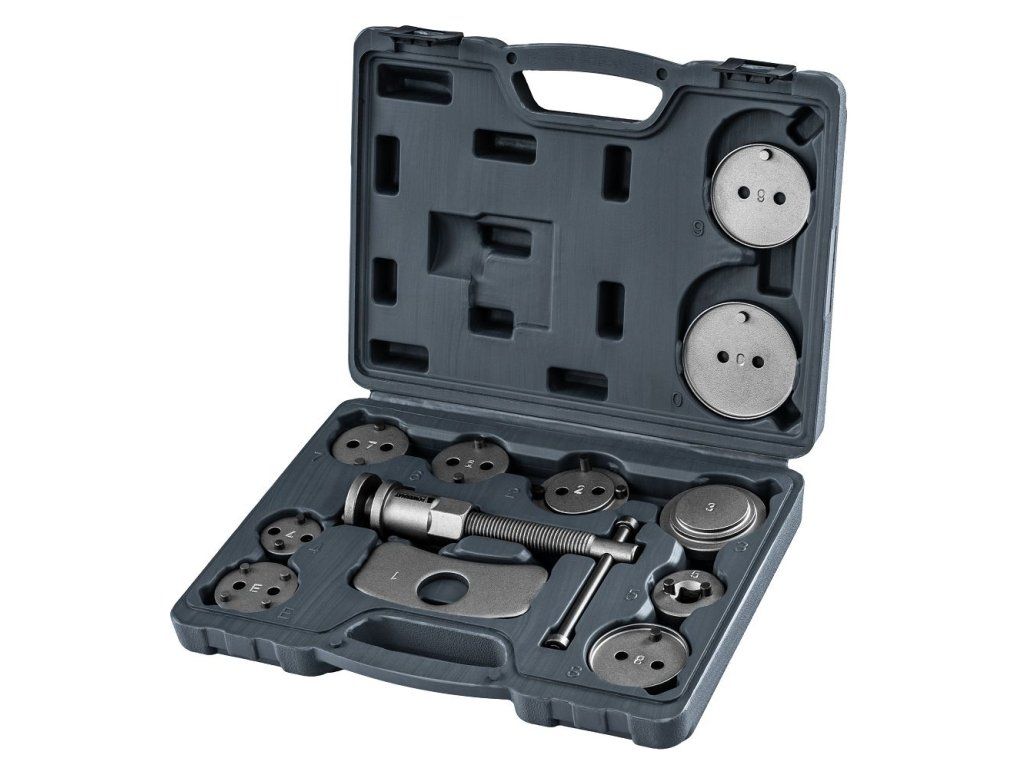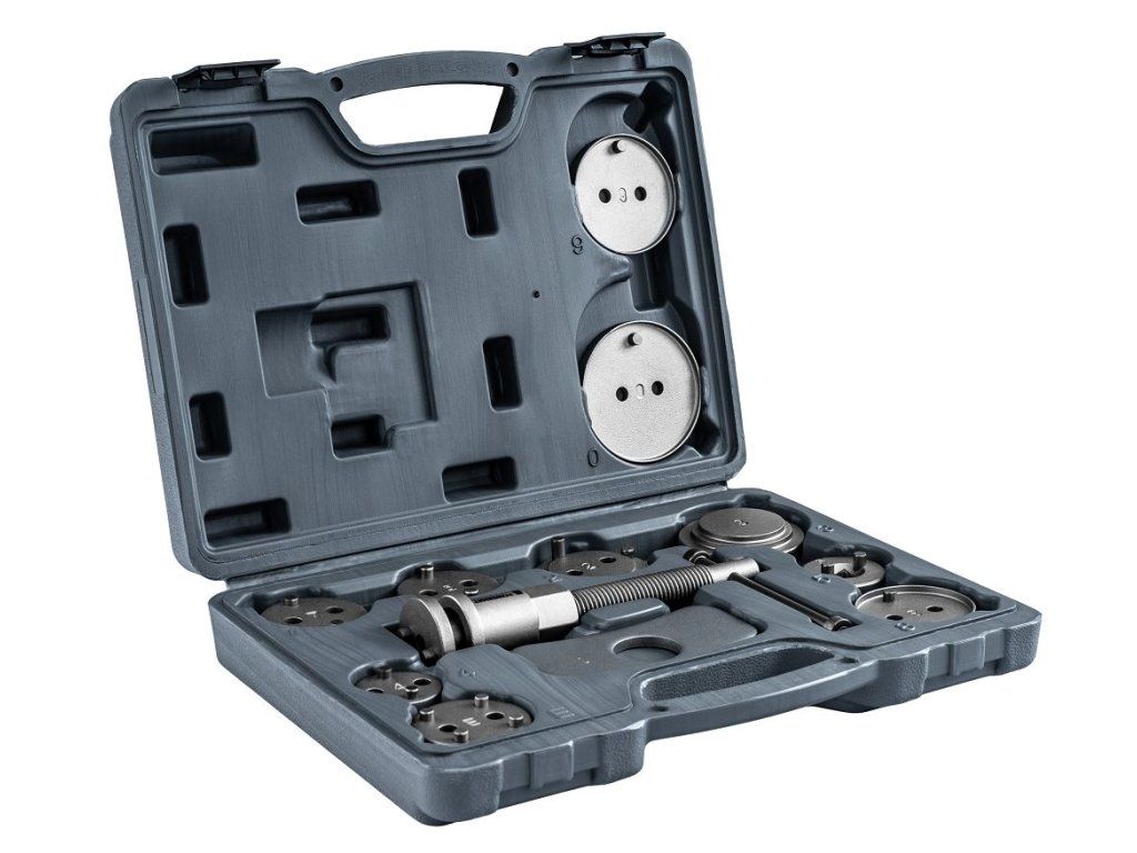 - Zawartość zestawu: praska do cofania tłoczka hamulcowego + 11 adapterów