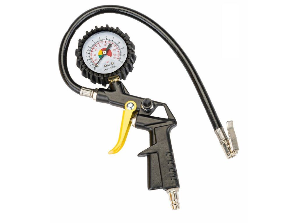 Součástí balení je pistolet do pompowania z manometrem a 9 populárních koncovek pro různé aplikace.