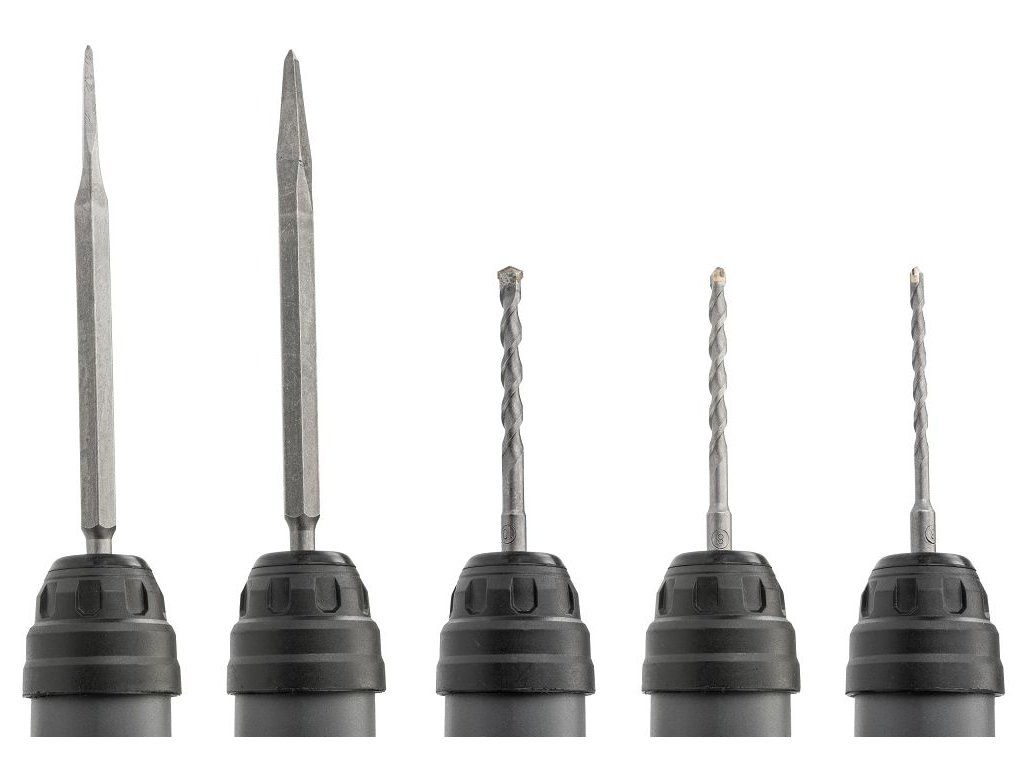 - Obsah balení: kladivo, transportní kufřík, 3 vrtáky, špičák, dláto a další příslušenství