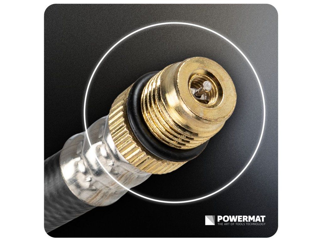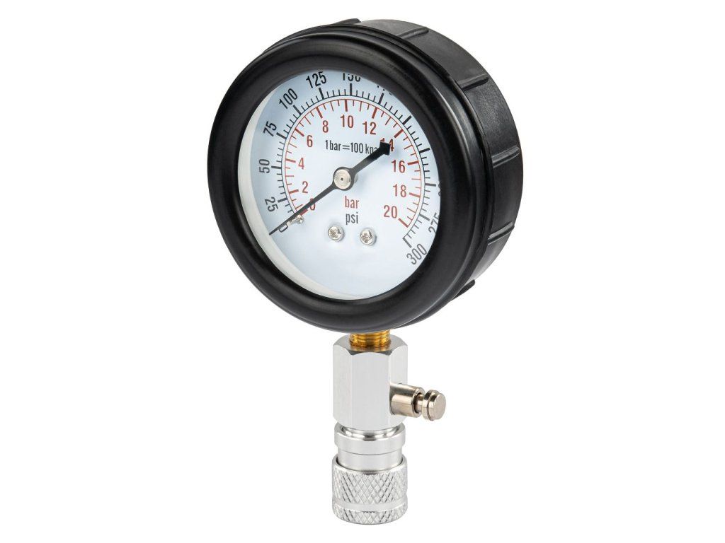 Analogový manometr s dvojitou stupnicí (Bar/PSI) zajišťuje přesné a snadno čitelné výsledky měření.