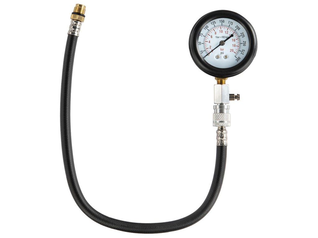 Obsahuje vše potřebné pro rychlou diagnostiku: manometr, hadici, adaptéry a praktickou transportní krabici.