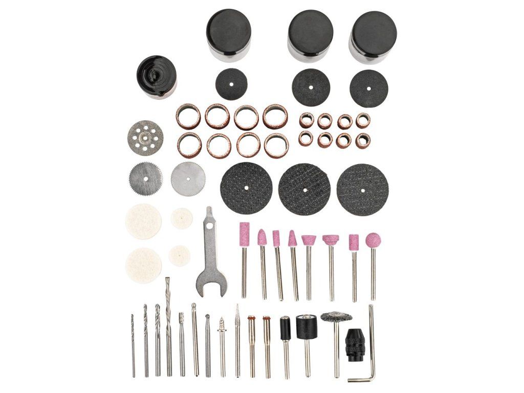 - Obsahuje bohaté příslušenství včetně 10 fréz a 65 velkých kotoučů
