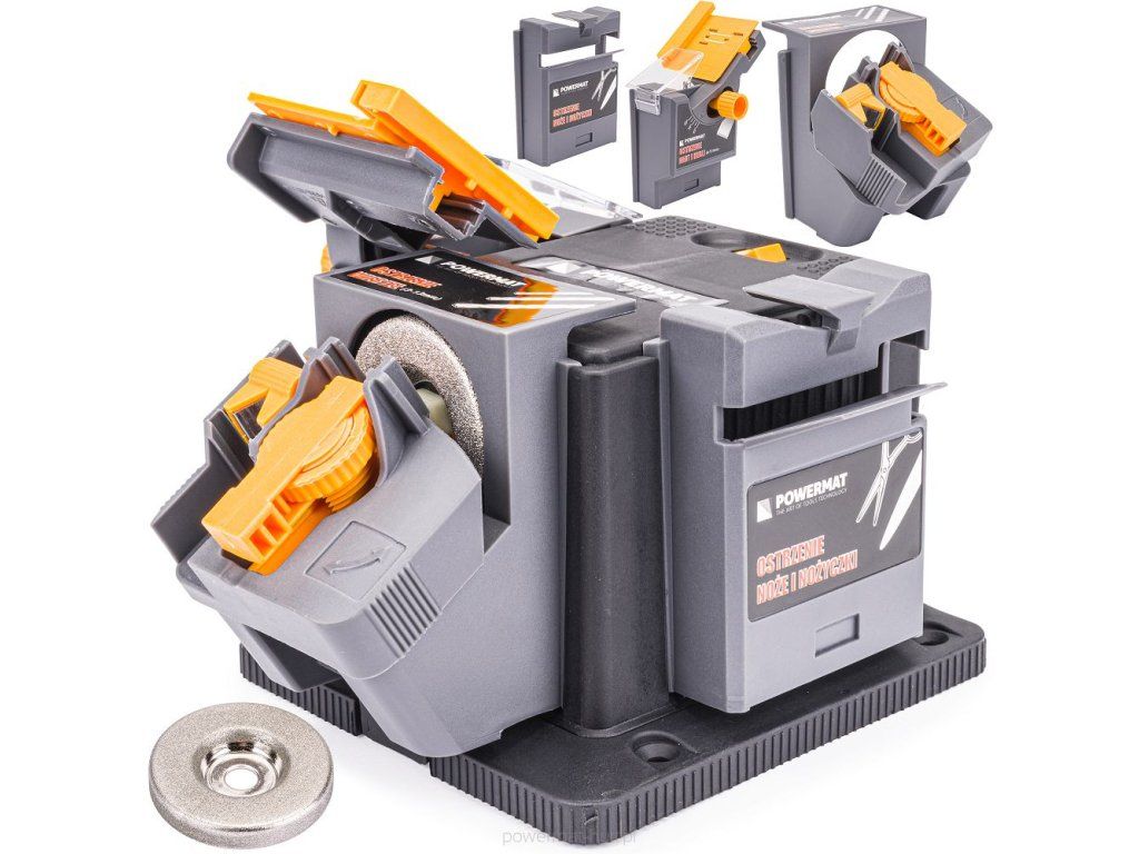- Ostrzałka 3W1: Wiertła HSS, Noże i Nożyczki, Dłuta i Heble