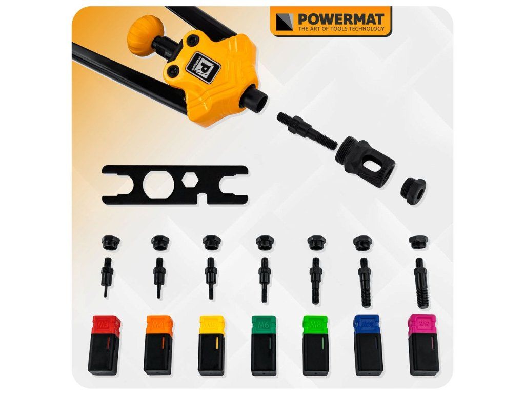 Ruční nýtovačka Powermat PM-NIR-360T je ideálním nástrojem pro profesionální i domácí použití. Díky své robustní konstrukci a snadné manipulaci je vhodná pro nýtování matic různých velikostí od M3 do M12. Ušetří vám čas i námahu při práci.