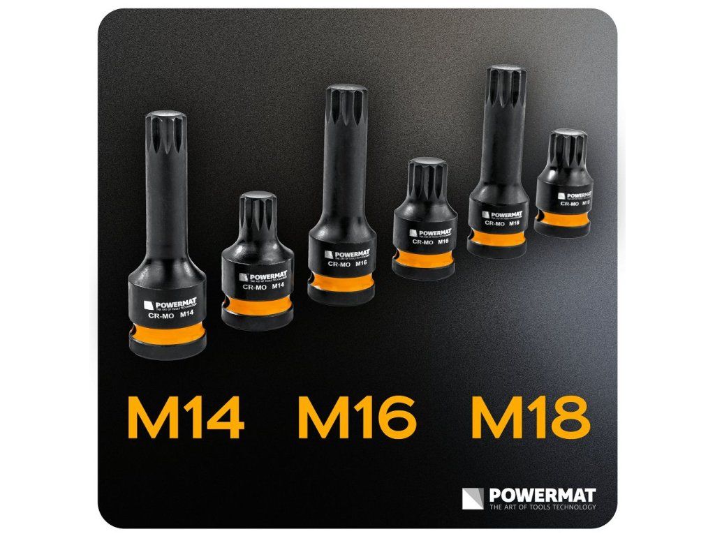 - Jaké jsou rozměry hlavic? Sada obsahuje hlavice ve velikostech M14, M16 a M18.