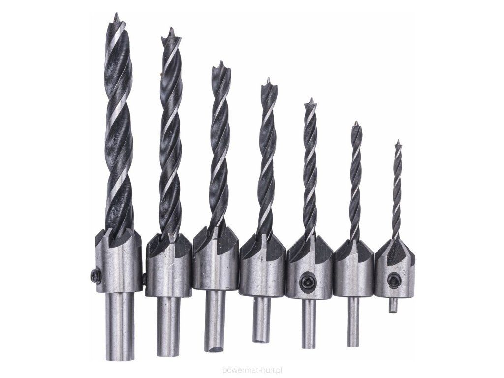 Obsahuje sedm vrtáků s prohlubníky a klíč imbusový pro snadnou regulaci. Ideální pro různé materiály jako dřevo, MDF nebo OSB.