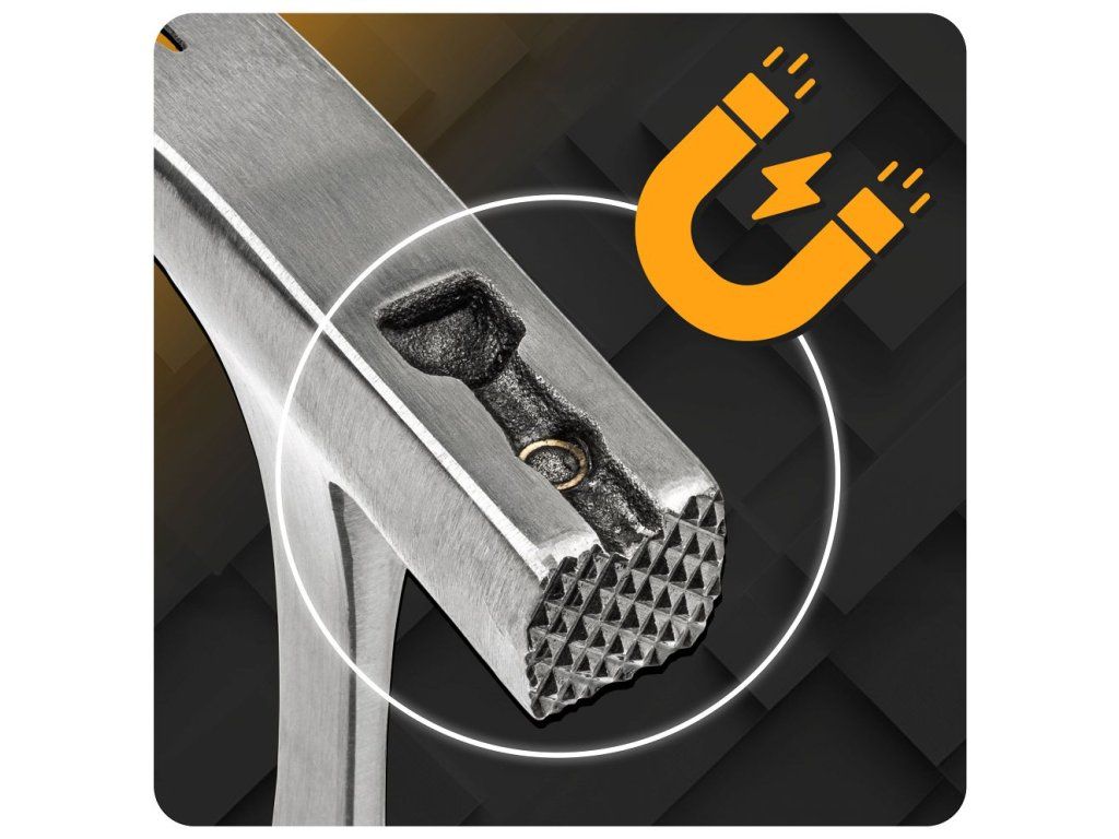 - Má kladivo magnetický úchyt? Ano, má speciální magnetický žlábek pro osazování hřebíků.