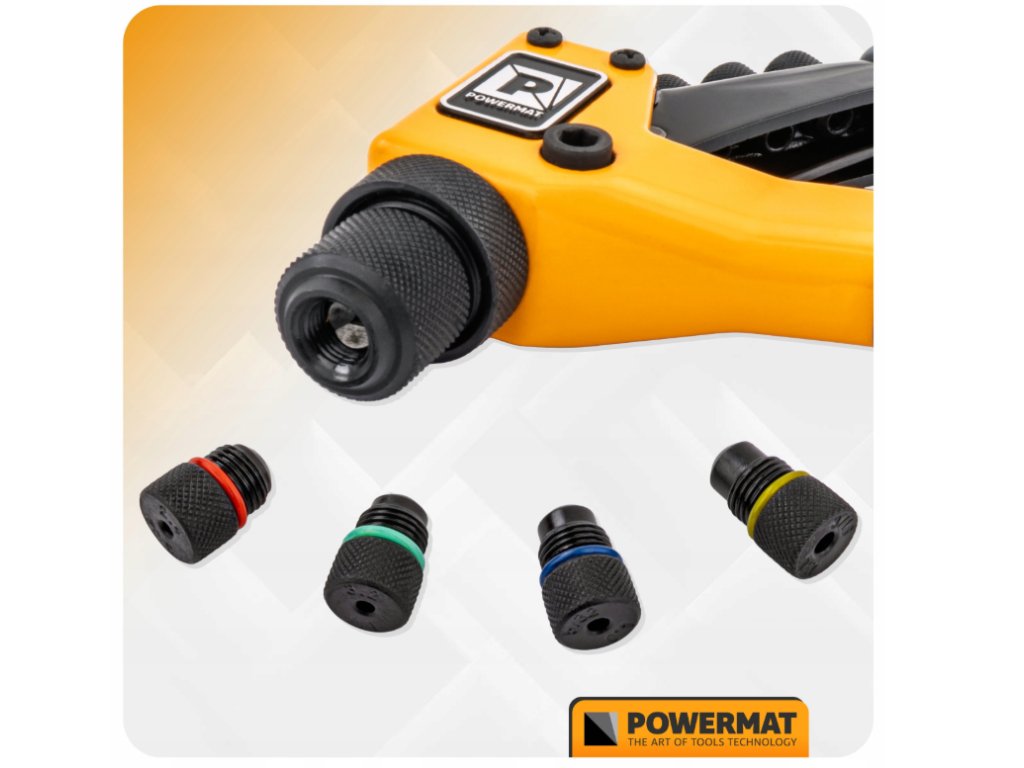 Součástí sady jsou výměnné hlavy pro nýtování nýtů o průměrech 2,4 mm, 3,2 mm, 4,0 mm a 4,8 mm, které pokrývají nejčastěji používané velikosti. Nýtovačku snadno nastavíš podle typu nýtu, který právě používáš.