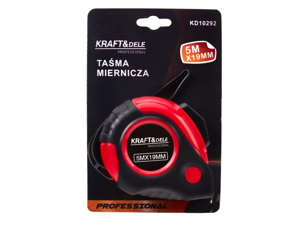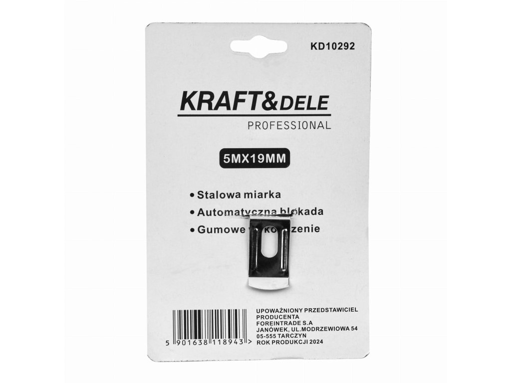 - TECHNICZNE PRODUKTU Marka: KRAFT&DELE Model: KD10292 Typ narzędzia: taśma miernicza Rozmiary: 5M x 19mm Antypoślizgowy uchwyt: TAK Automatyczna blokada taśmy: TAK