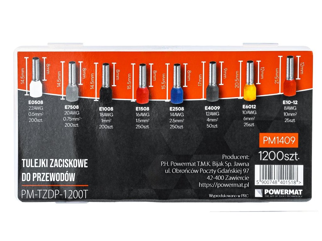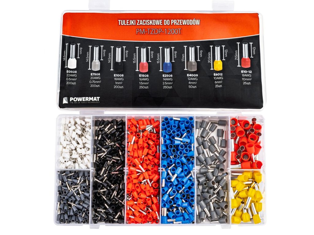 Sada izolovaných lisovacích dutinek POWERMAT PM-TZDP-1200T obsahuje 1200 ks barevně označených dutinek pro profesionální i domácí elektroinstalace. Dutinky umožňují bezpečné a trvalé zakončení vodičů s průřezy od 0,5 mm² do 10 mm², stabilizují vícežilové vodiče a zajišťují spolehlivé elektrické kontakty bez rizika poškození izolace.