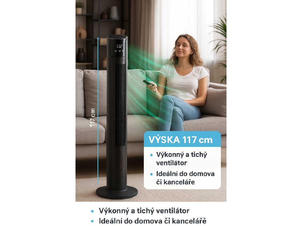 Výkonný sloupový ventilátor s výškou 117 cm a výkonem 100 W, navržený pro efektivní, tichý a rovnoměrný proud vzduchu. Široká nabídka režimů, turbínové proudění a pohodlné ovládání – ideální do obýváku, ložnice i kanceláře.