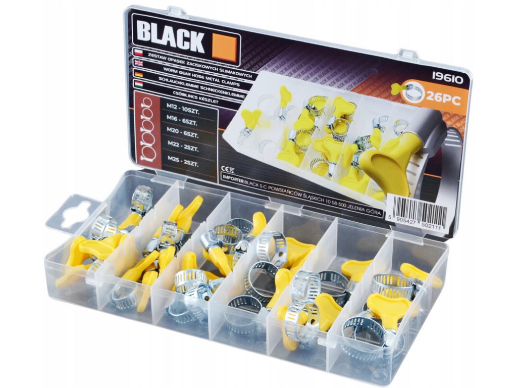 Sada obsahuje svorky v různých velikostech, které lze sešroubovat bez potřeby jakéhokoli nástroje.