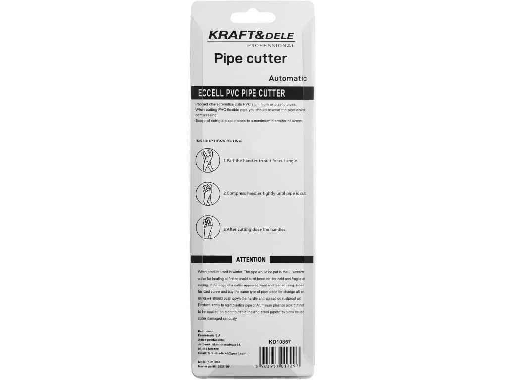 Řezání trubek už nikdy nebude problém. S naší řezáčkou KD10857 zvládnete rychle a přesně zpracovat PVC, plasty a hliník. Mějte jistotu v klidných a bezpečných řezech díky ergonomické rukojeti. Tento nástroj je ideální pro každodenní upravy, ať už jste instalatér nebo zručný domácí kutil. Balení obsahuje 12měsíční záruku.