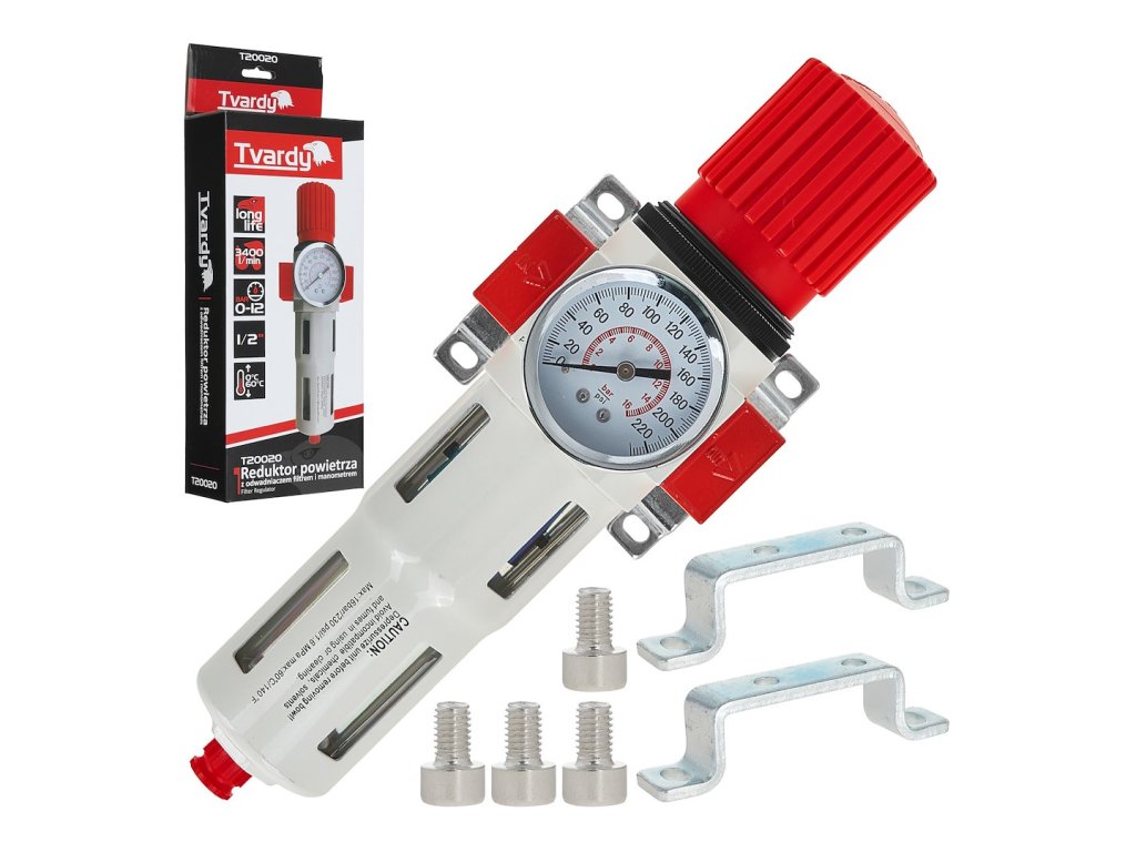 Profesionální reduktor vzduchu značky Tvardy je spolehlivé zařízení určené pro pneumatické instalace, kompresory a veškeré nástroje poháněné stlačeným vzduchem. Kombinuje tři funkce: redukci tlaku, filtraci a odvodnění, čímž zajišťuje čistý vzduch s odpovídajícím tlakem.