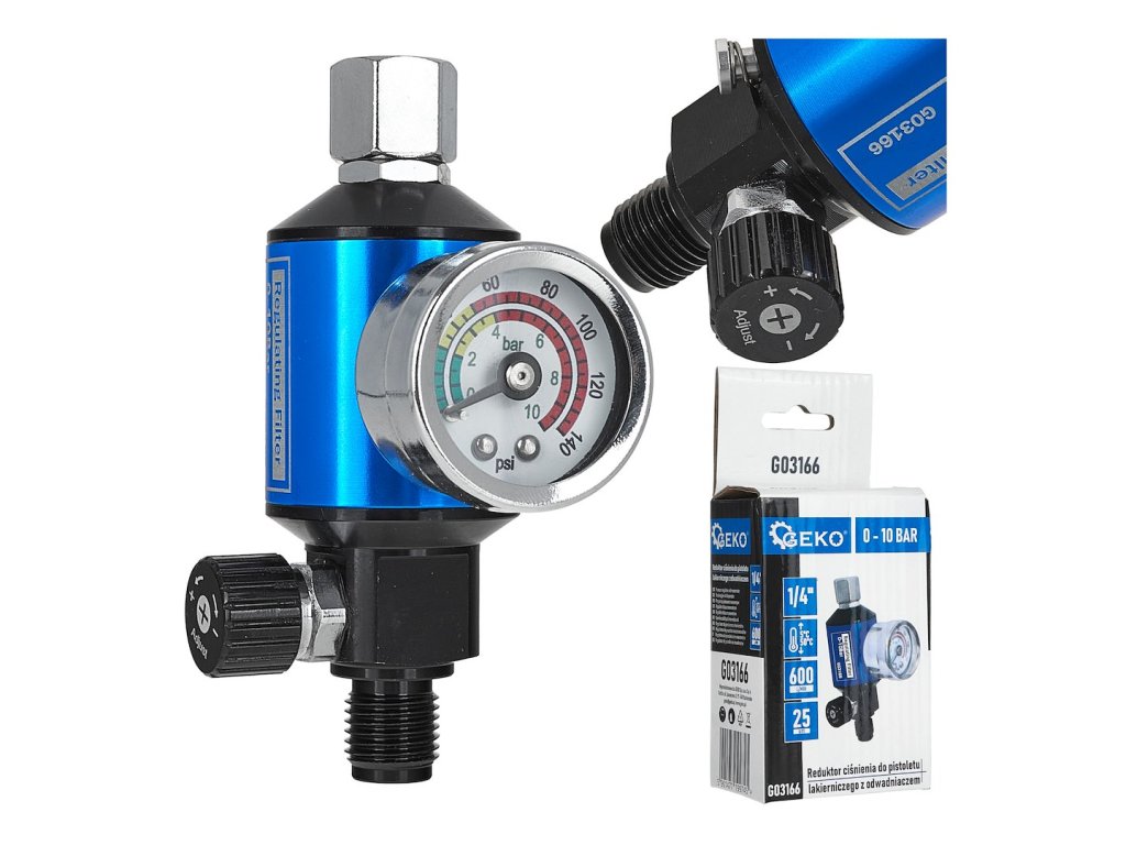 Profesionální regulátor tlaku s filtrem a integrovaným odlučovačem je nezbytným příslušenstvím pro každého, kdo používá lakovací pistole a pneumatické nářadí. Zařízení umožňuje přesnou kontrolu tlaku vzduchu a zároveň jej čistí od nečistot a vlhkosti. Díky tomu jsou lakování a dokončovací práce přesnější a zařízení je chráněno před poškozením.