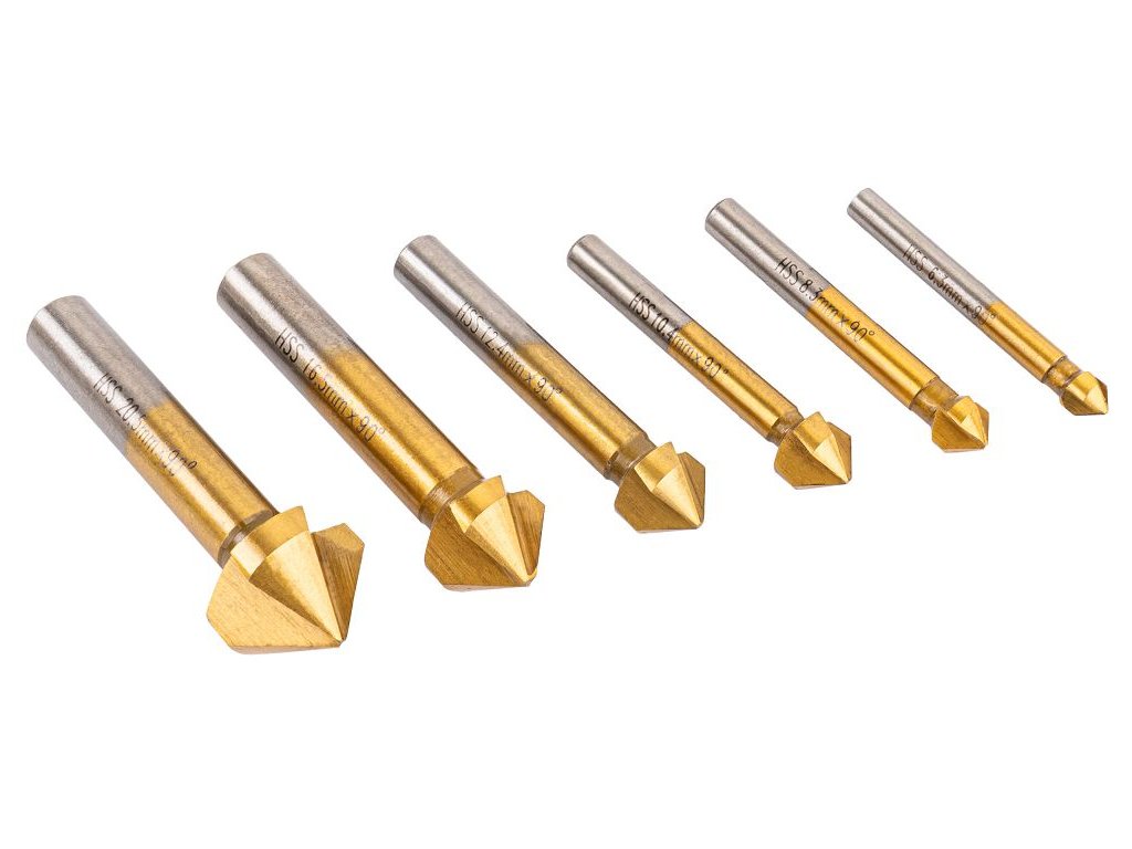 Sada 6 kuželových záhlubníků / fazetovacích fréz Powermat PM-ZPM-6T pro přesné zahlubování, srážení hran a odjehlování otvorů pod zápustné šrouby. Vyrobeno z rychlořezné oceli HSS, s 3 spirálovými břity pro plynulý odvod třísek. Vhodné pro vrtačky, aku šroubováky i soustruhy.