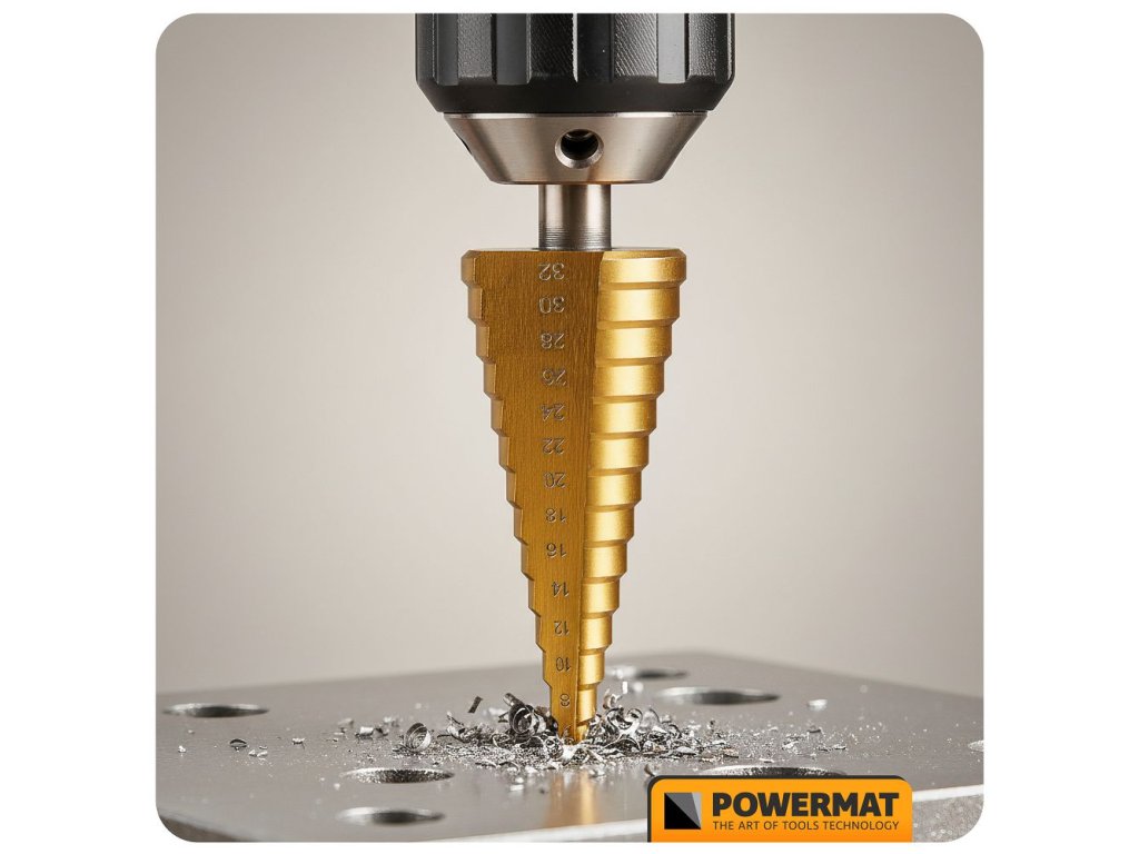 - Je to vrták, který má několik průměrů v jednom těle a umožňuje postupně zvětšovat otvor bez výměny nástroje.