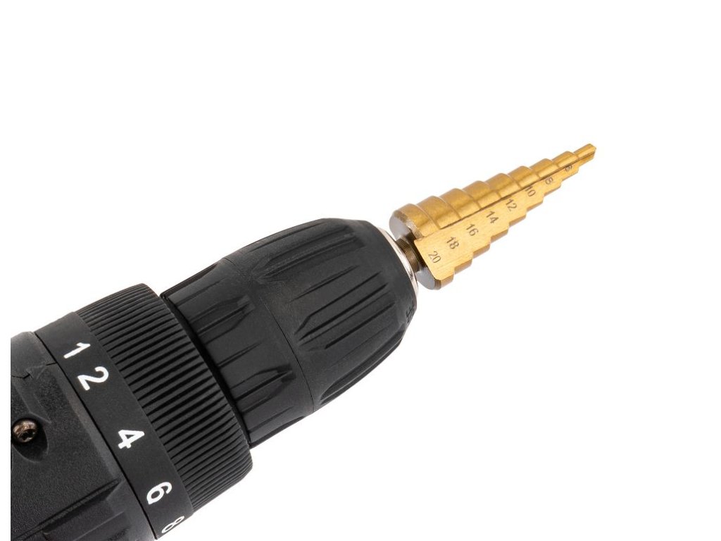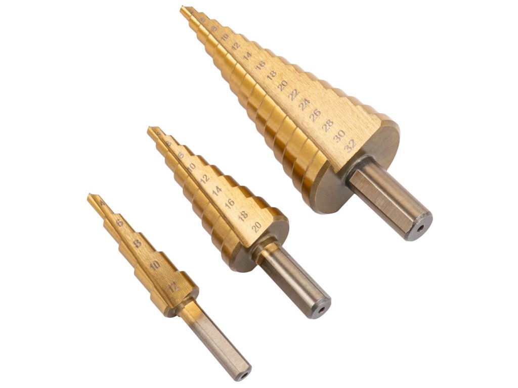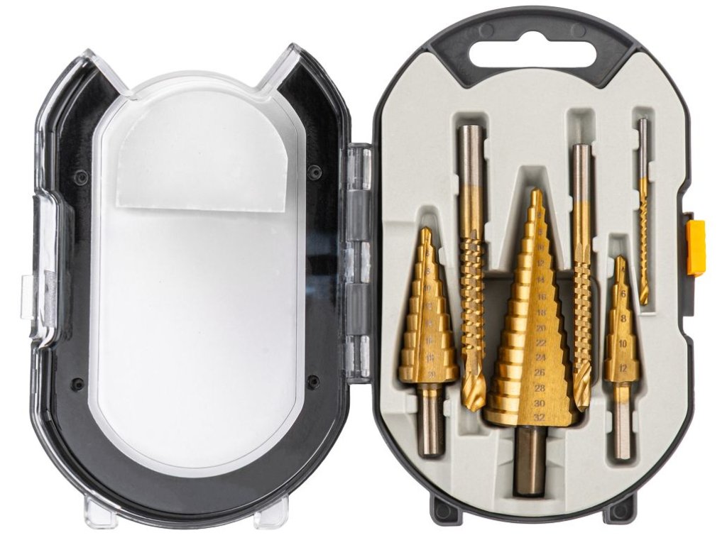 ✔ Sada 6 kónických (stupňovitých) vrtáků HSS pro přesné vrtání otvorů 4 – 30 mm