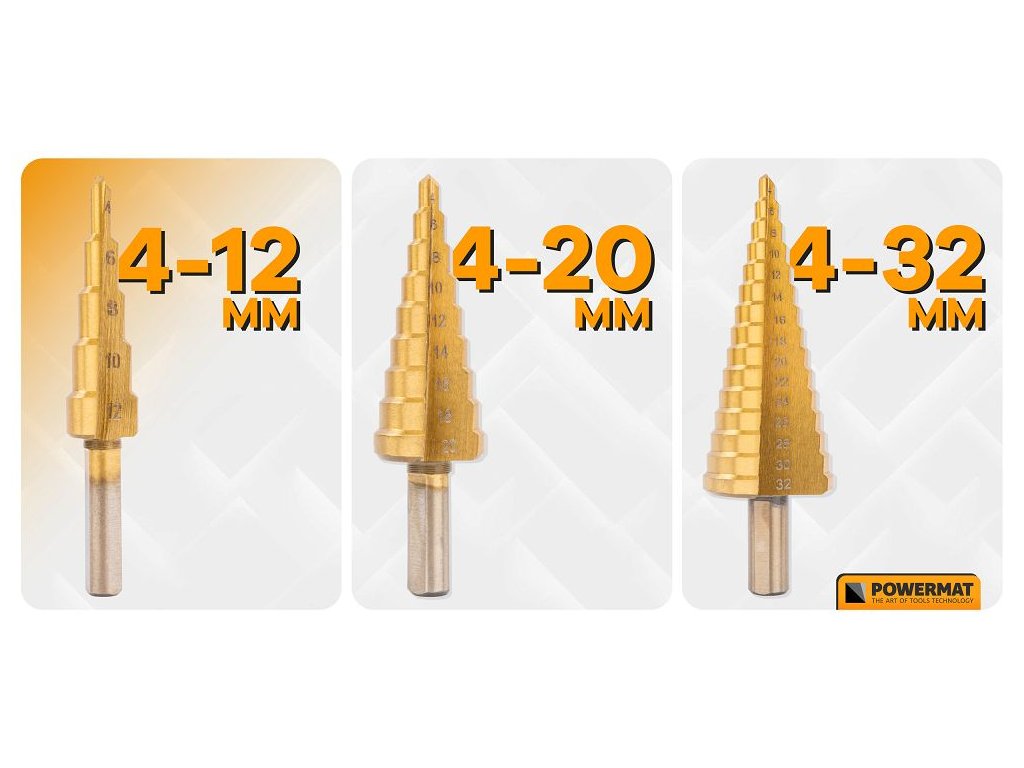Stupňovité (kónické) vrtáky POWERMAT PM-ZWSF-6T HSS – sada 6 ks, 4–30 mm