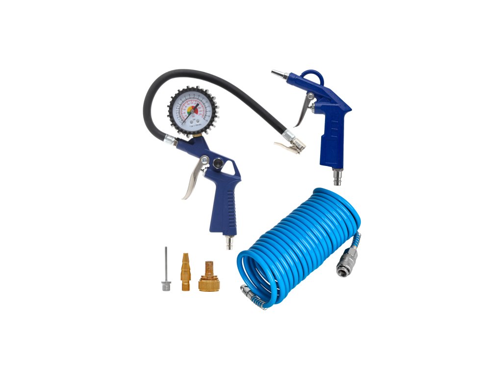 - 5m spirálová hadice: Umožňuje flexibilní propojení pneumatických nástrojů a prodloužení stávajících systémů.