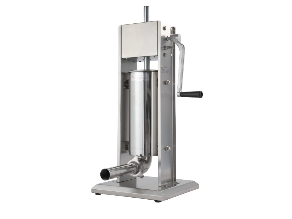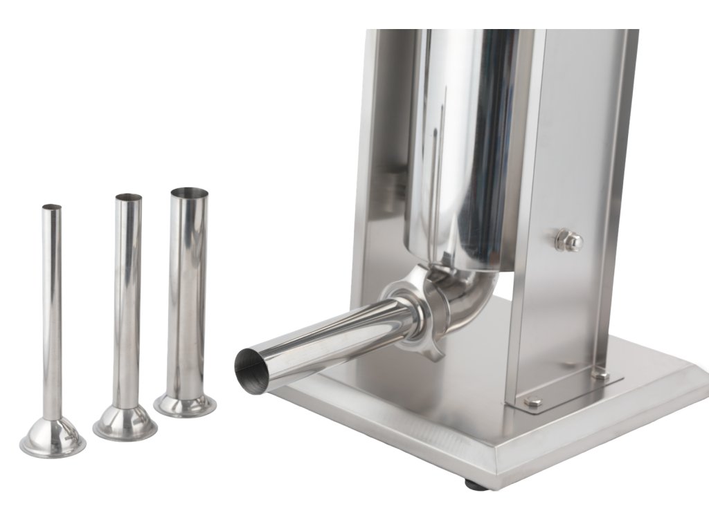 Plnička se pevně uchytí ke stolu nebo pracovní desce pomocí šroubových úchytů, takže se při práci neposouvá. Součástí balení jsou 4 nástavce (lejky) – přibližně 16 mm, 22 mm, 32 mm a 38 mm – takže snadno vyrobíte různé typy párků, klobás i jitrnic.