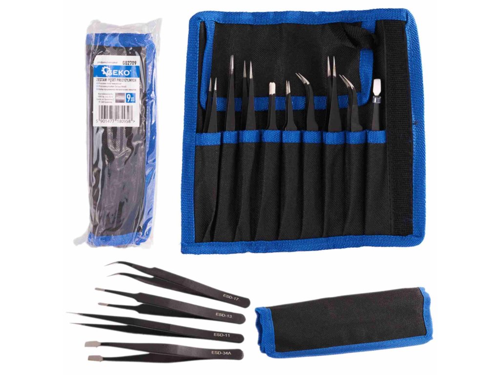 Sada 9 kusů přesných kovových pinzet je ruční nářadí používané pro přesné práce, zejména v oblastech jako elektronika, biologie nebo modelářství. Tyto pinzety jsou obvykle vyrobeny z vysoce kvalitního kovu, což zaručuje jejich trvanlivost a přesnost. Sada obsahuje pinzety různých velikostí a tvarů konců.