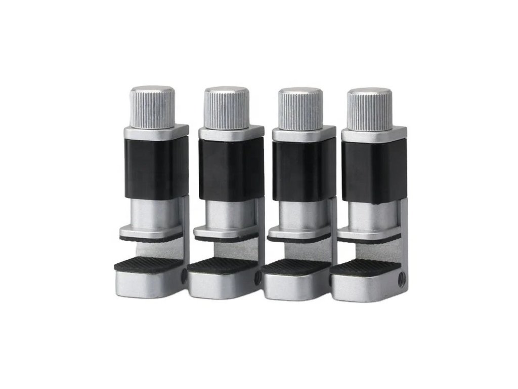 - Pogumované přítlačné plochy: Každý svěrák je vybaven pogumovanými přítlačnými plochami, které zajišťují jemné uchycení displeje bez rizika poškození. Pogumované plochy také minimalizují prokluz, čímž zajišťují pevné a stabilní uchycení.